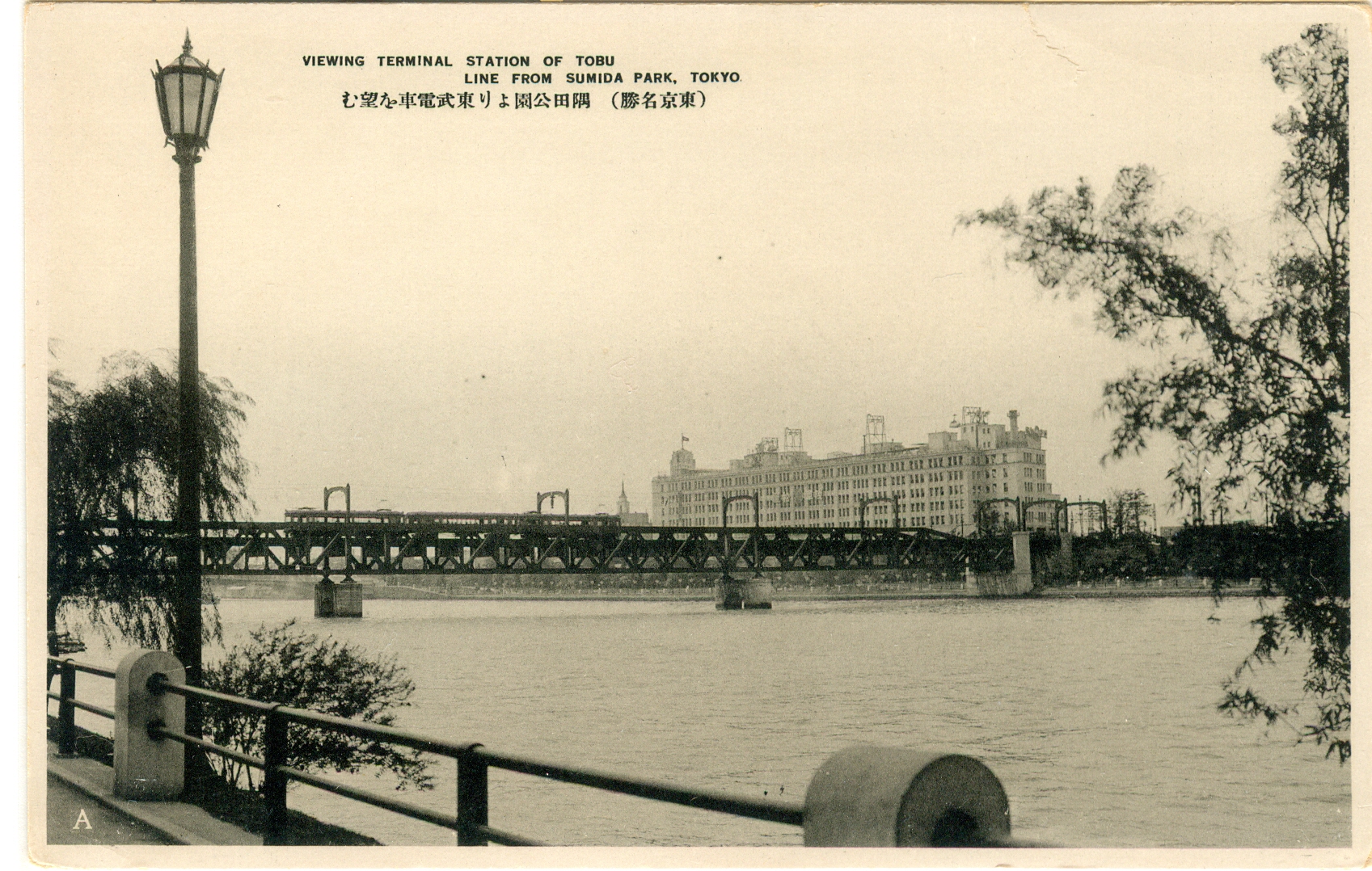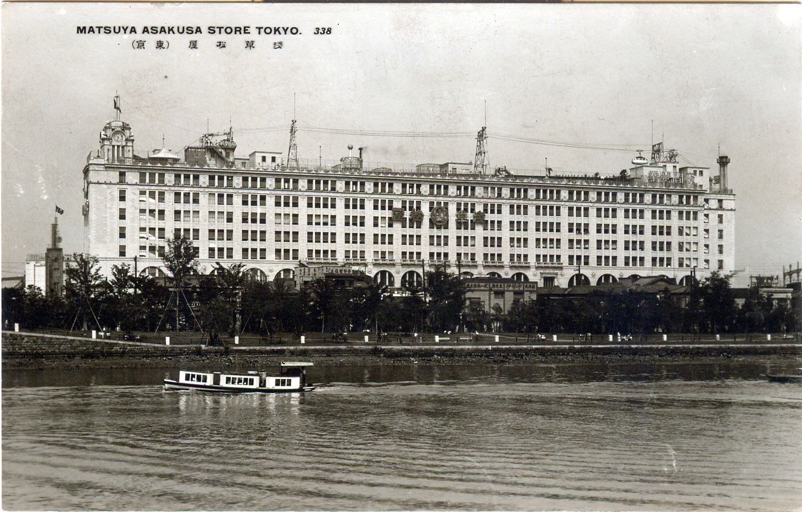 - Looking across the Sumida River at Tobu Azumabashi and Matsuya Asakusa, c. 1930.