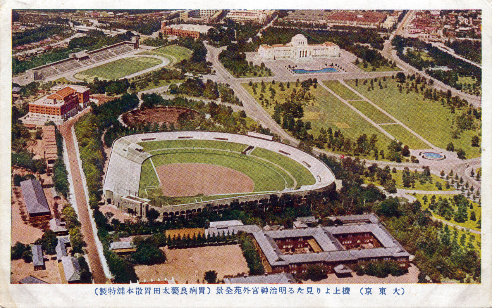 Meiji Jingu Gaien Stadium (foreground) for baseball, Meiji Field (upper left) for track and field events, the Wrestling Ring (between the stadium and field), and the Meiji Gallery (upper right) at Meiji Shrine Outer Garden, Tokyo, c. 1930. The original Meiji Field would be demolished after the war and replaced by the larger National Olympic Stadium for the 1964 Summer Olympiad.