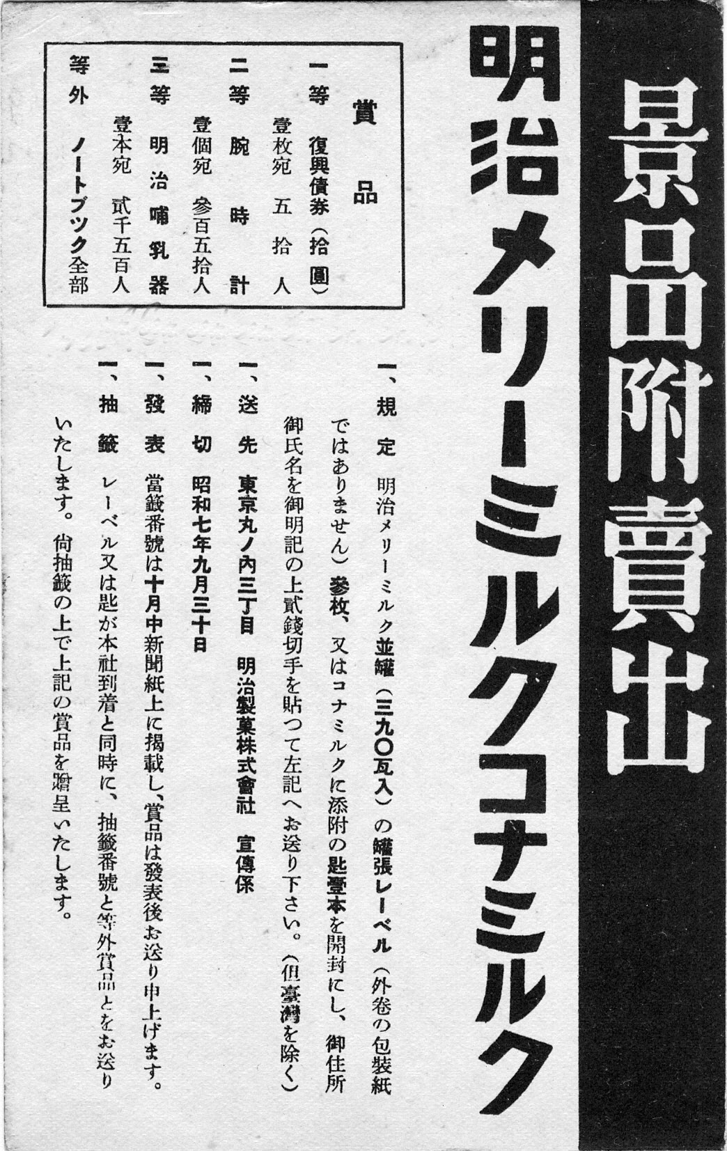 Backside of advertising postcard, c. 1930, promoting Meiji Merry Milk brand “Kona Miruku” (Condensed Milk) with mail-in contest instructions. First-prize: a ¥1000 (US$500 ca. 1930) “restoration” bond awarded to five people.
