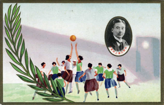 The 3rd Meiji Shrine Games commemorative postcard, Tokyo, 1926. Inset is a photo of Meiji-era physical fitness advocate Kano Jigoro, professor and headmaster at the Tokyo University of Education (later the University of Tsukuba), inventor of judo, and the first Japanese (and first Asian) member of the International Olympic Committee.