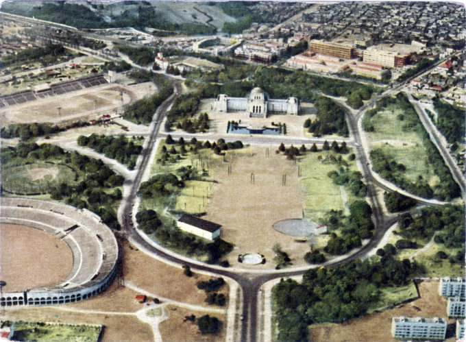 Whole view of Meiji Park Outer Garden, c. 1935. The Meiji Memorial Picture Gallery is at upper-right. Below the Meiji Jingu baseball stadium (at center) is the Peeress’ School, relocated to Yotsuya in 1885 from Kanda. The school would later be merged with Gakushin, relocate to Meijiro and the property in the Outer Garden replaced after WWII by a the national rugby stadium. Meiji Jingu Stadium is one of the few professional stadiums still in existence where Babe Ruth played. In 1934, Ruth joined several other famous baseball players from the U.S., such as Lou Gehrig and Jimmie Foxx, in a 22-game tour of Japan.