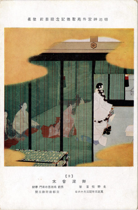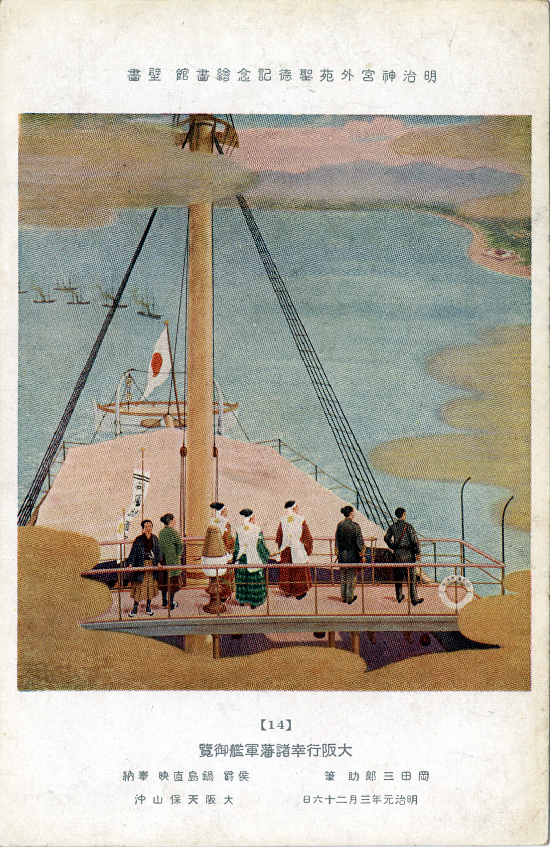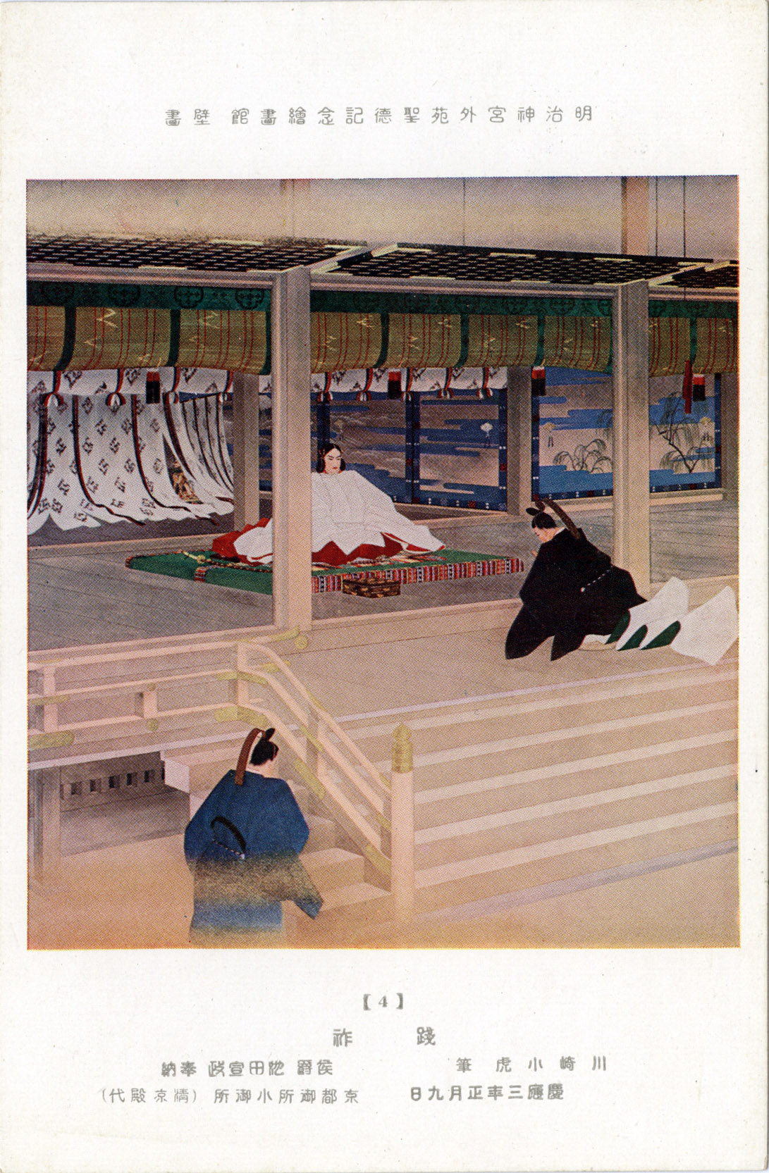 “[The] Meiji Shrine Memorial Art Gallery (Meiji Jingu Seitoku Kinen Kaigakan) was constructed as a mnemonic space, and that its construction concerned the making of history. The purpose of the gallery was to provide a historical narration of the Meiji period through 80 paintings depicting Emperor Meiji’s life.