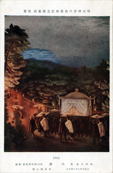 - No. 80: The Imperial Funeral (Sept. 14, 1912). After a ceremony at the Aoyama Funeral Pavilion in Tokyo on 13 September, the Emperor’s coffin was taken by train to Kyoto, before being conveyed to Fushimi Momoyama no Misasagi.