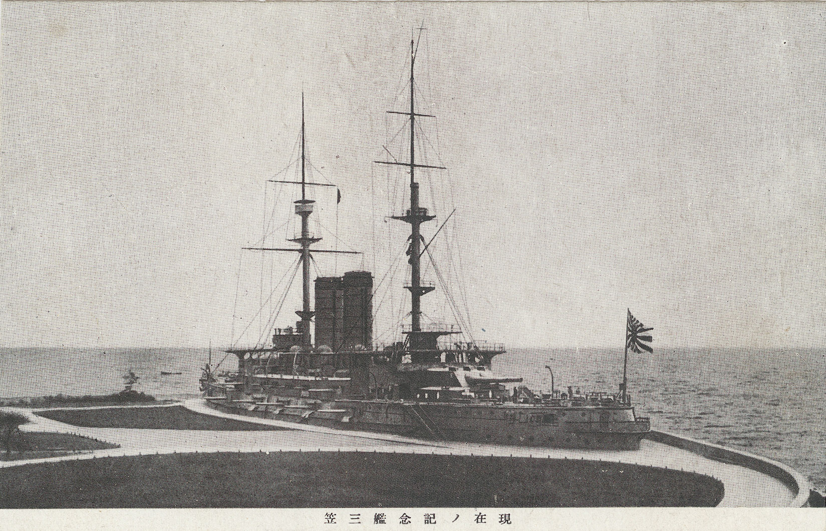 Memorial battleship Mikasa, Yokosuka, c. 1930. Rescued from scrapping, the entire hull of Mikasa was ensconced in concrete ca. 1925 at the edge of Yokosuka harbor for display as a memorial and museum, the only remaining pre-Dreadnought battleship in the world.