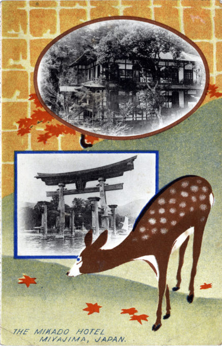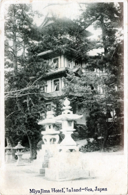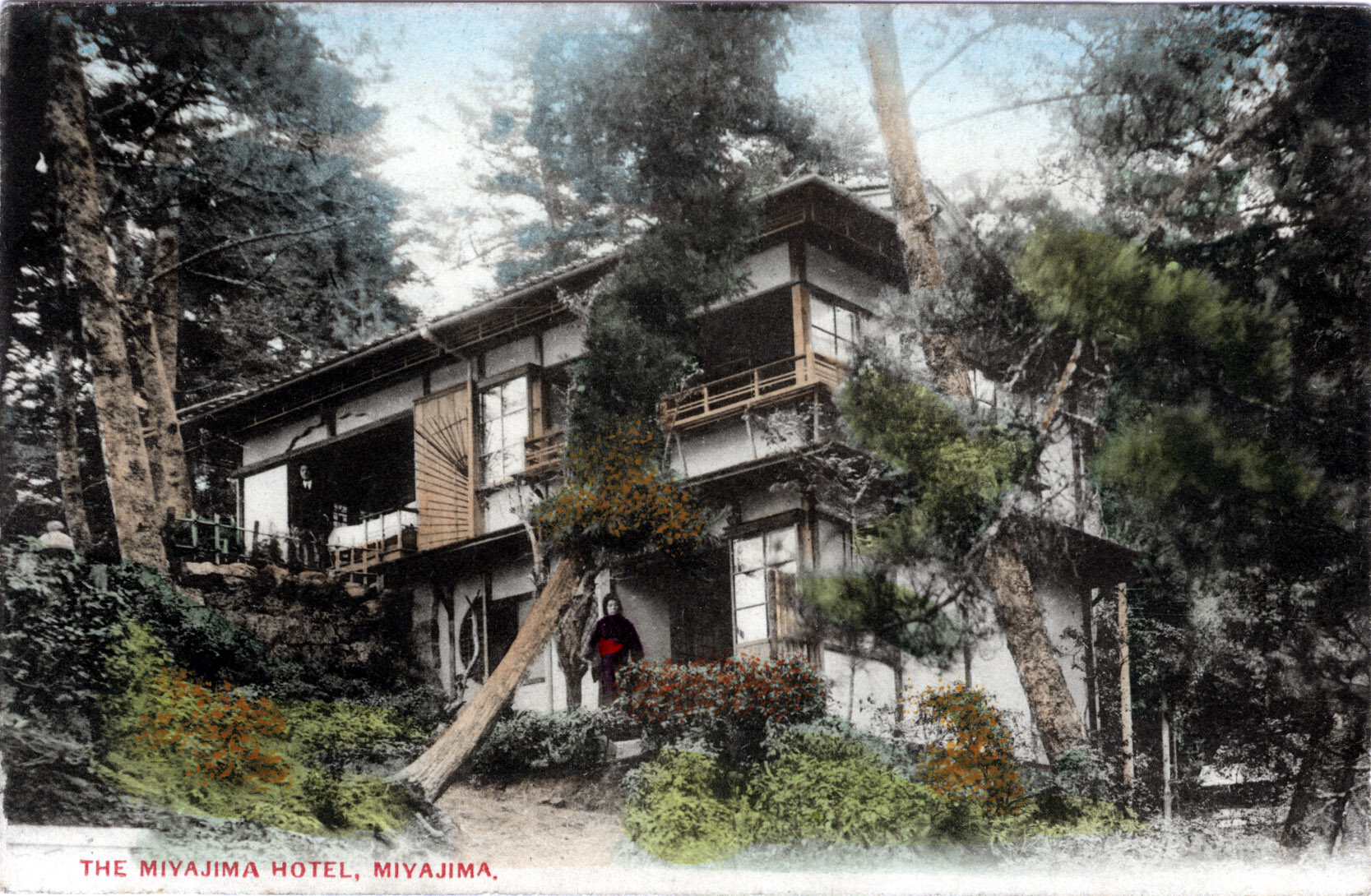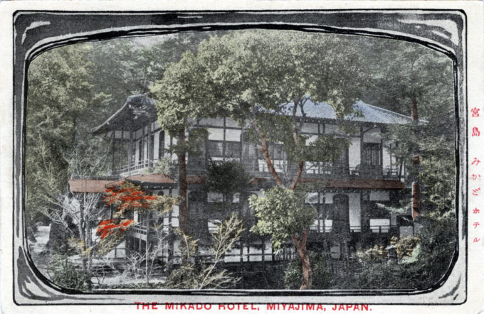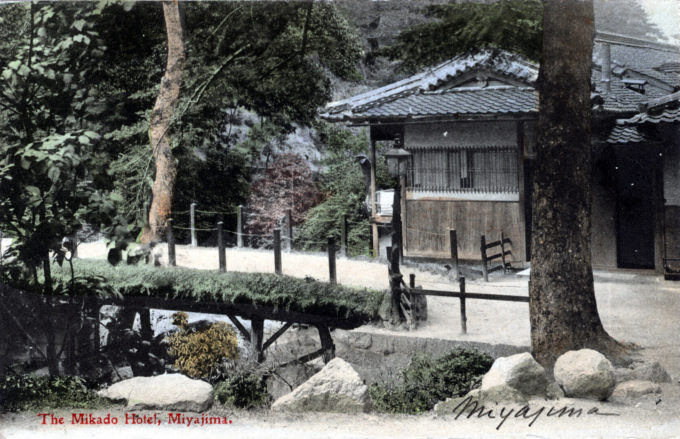 “The Miyajima Hotel, formerly the Mikado Hotel, stands near the beach, at the entrance to the Omoto Park, in a beautiful spot opposite the mainland. The sea breezes, fountains, running water and deep shade, make it cool in summer and the tree-clad hills shelter it from the cold blasts of winter.