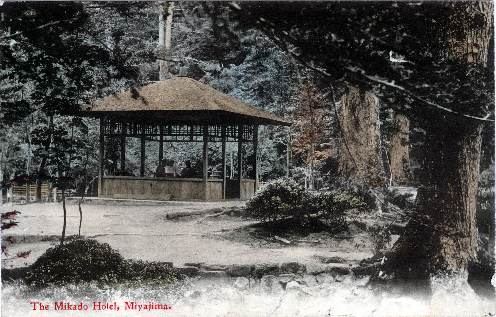 - Gazebo under the forest canopy, Mikado Hotel, Miyajima, c. 1910.