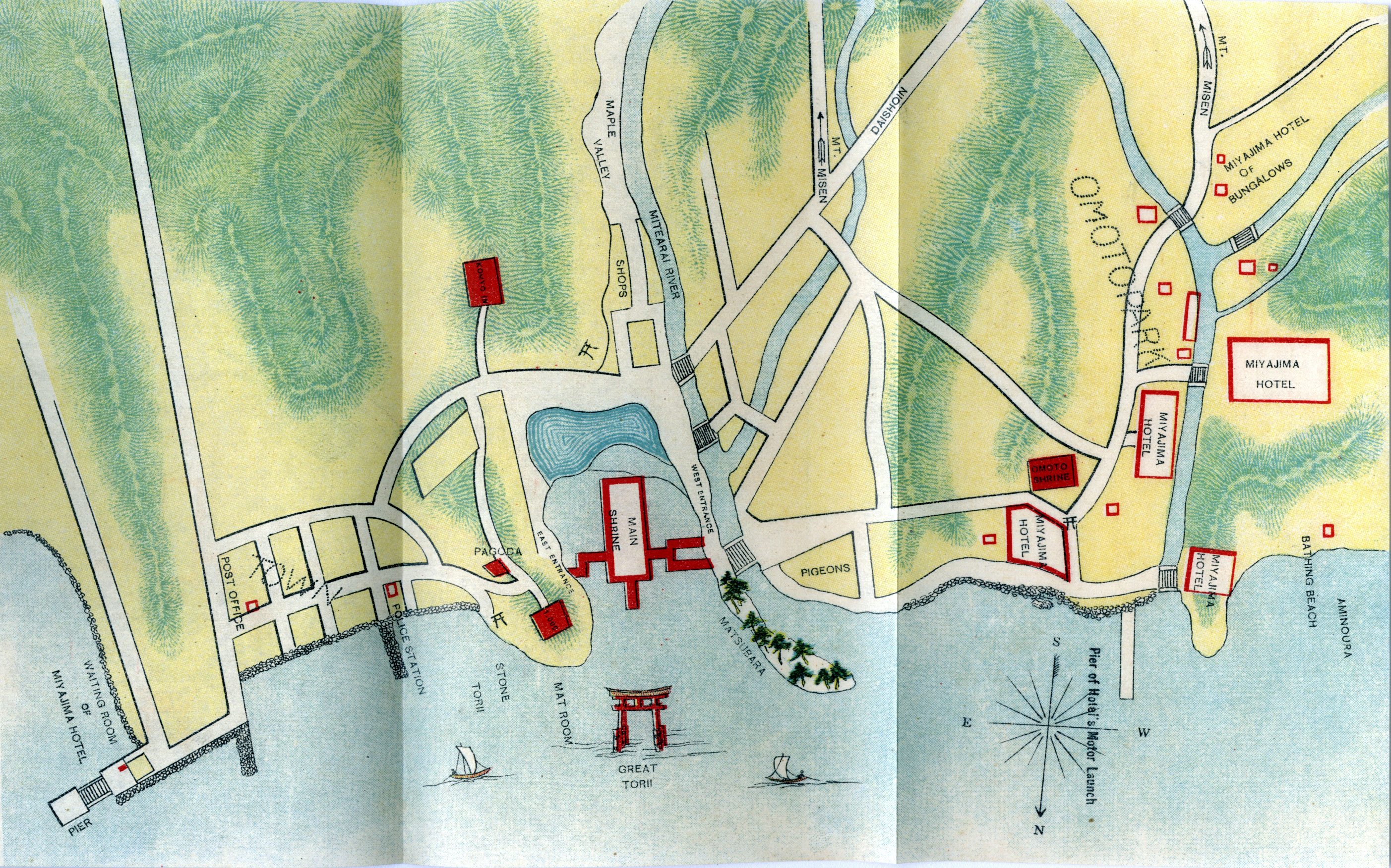 Map of Miyajima, depicting the Great Torii (lower center), Itsukushima Shrine, and the sprawling grounds of the Miyajima Hotel (at right). [Source: A Short Guide to Miyajima, Miyajima Hotel, 1913.]