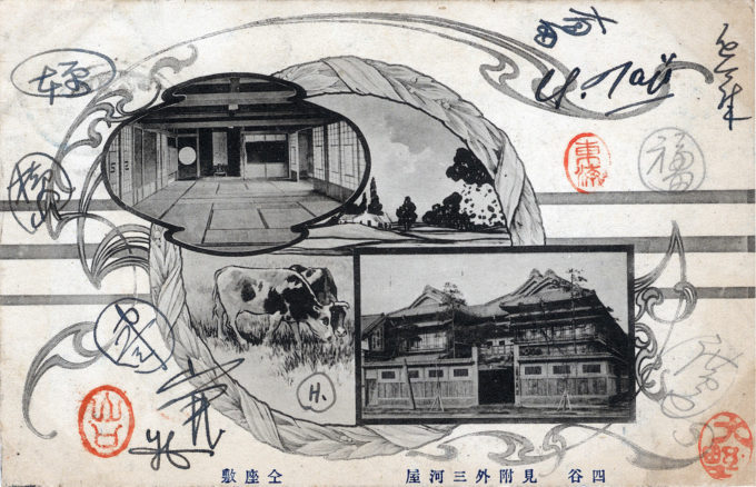 Mikawaya ryokan at Kowakidani hot spring, Yotsuya-Hakone, c. 1920. An historic inn established in 1883, and visited by painter Takehisa Yumeji, poet Yosano Tekkan, and Sun Yat-Sen, father of modern China, among other luminaries. The property has now been designated a Tangible Cultural Property of Japan.