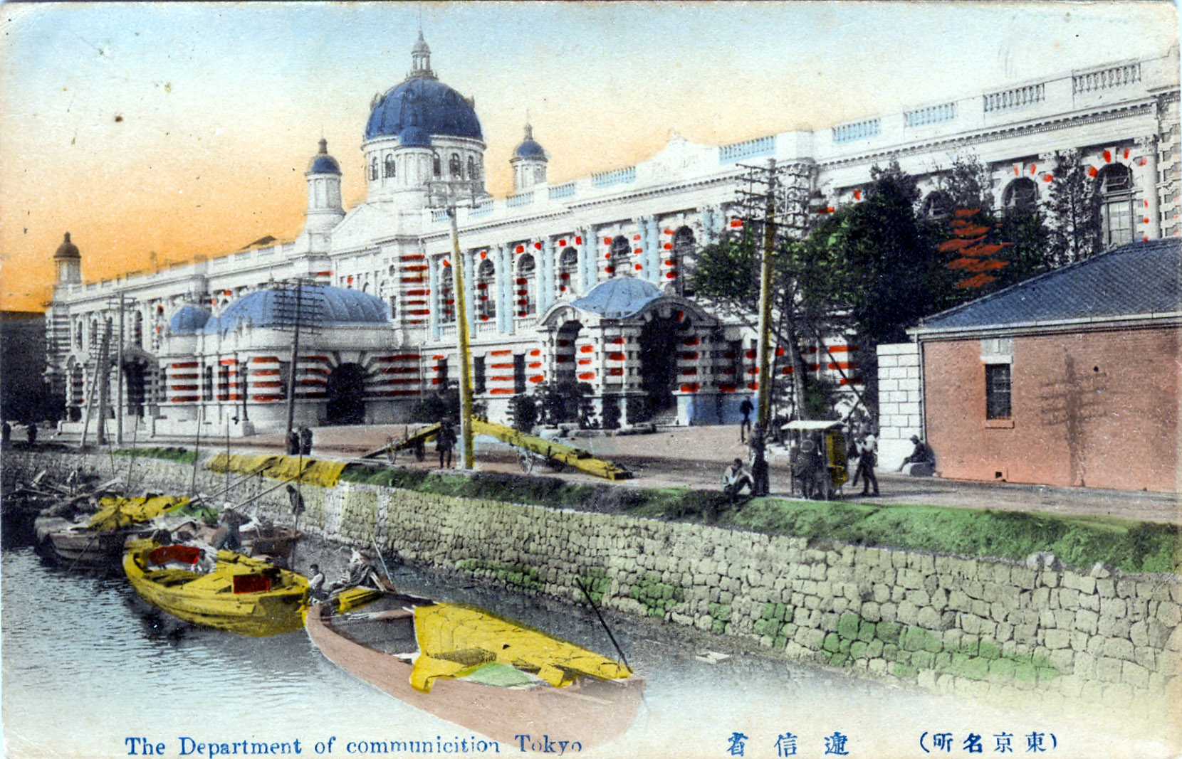 “The Department of Communication”, Tokyo, c. 1910. Construction was completed in May 1910. Although Satachi Shichijiro did not have the same illustrious career as a classmate, the architect of the new Ministry of Communications building was in the same 1879 graduating class of the Imperial College of Technology alongside another famous Tokyo architect, Tatsuno Kingo.