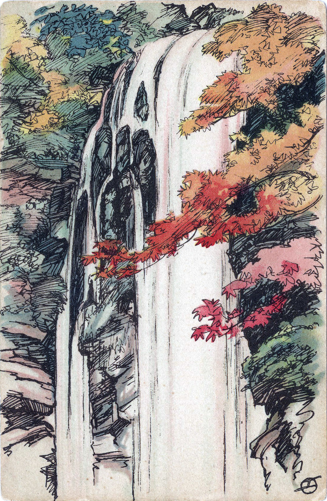 “The waterfall of Mino-o, near Osaka, as seen through the flaming maples in Autumn”, NYK tourist postcard, c. 1930.