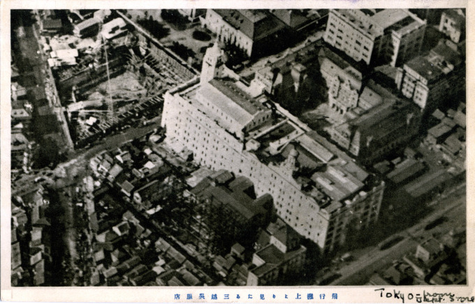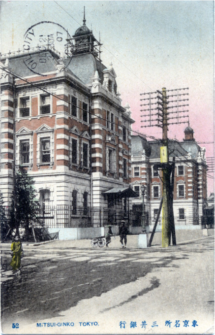 “The new office building for Mitsui Bank, Mitsui & Co. (Mitsui Bussan Kaisha), and Mitsui Mining Company,” at Nihonbashi, c. 1905. The Mitsui family began banking operations in 1683, when the Tokugawa Shogunate granted Mitsui Takatoshi permission to act as a money changer. Mitsui Bank was incorporated as a private company in July 1876, and was one of the Japanese government’s main banks for deposits and tax collections until the formation of the Bank of Japan in 1882.