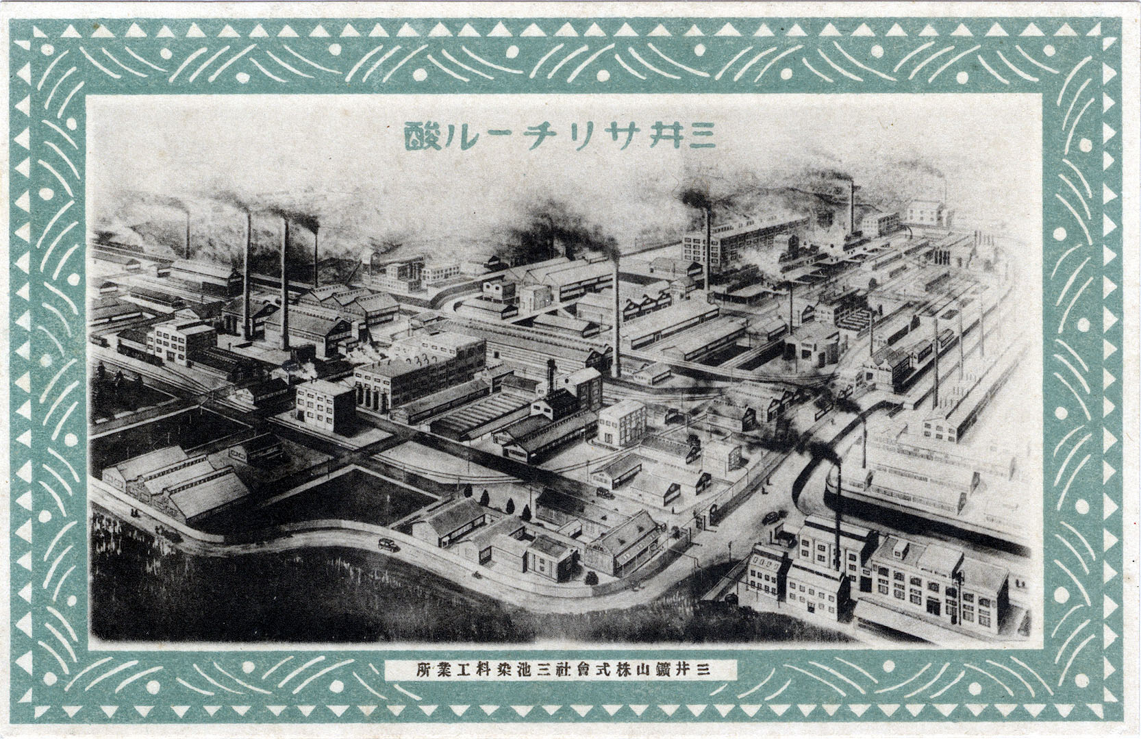 “Mitsui Salicylic Acid”, Miike Dye Works, Mitsui Mining Co., Omuta, Kyushu, c. 1928. The plant opened in 1927 to manufacture salicylic acid, an organic compound used to make medicated topical solutions with which to treat or prevent acne and other skin conditions – warts, psoriasis, calluses, corns. The chemical compound also had uses as a food preservative, a bactericide, and an antiseptic.