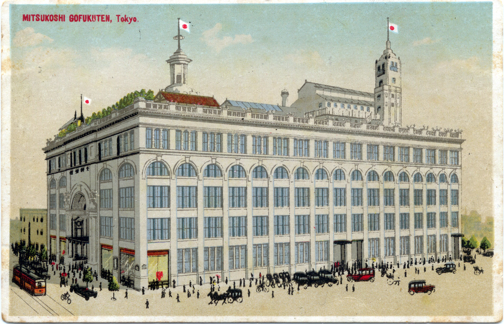 “In Japan at the turn of the century, the western-inspired commercial revolution was pioneered by the Japanese entrepreneurs of Mitsukoshi and its rival, Shirokiya, Tokyo’s first and largest department stores, offering their version of ‘modern life’ or modan raifu. Retailing novelties or curiosities from abroad, along with local products, in a novel and foreign way – selling almost everything under one roof, departmentalized and displayed behind glass-counters for a fixed price – by the post-earthquake era (1923) they stood literally as beacons (multi-storied above the horizontal lines of the city) of the changes that were transforming all aspects of Japanese life …