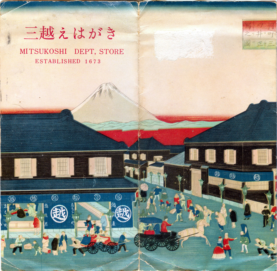 Mitsukoshi Gofukuten advertising postcard for the first Western-style department store that replaced Echigoya in 1903. Postcard was printed to commemorate the arrival of the US naval squadron, the “Great White Fleet“, to Japan in 1908, inviting them to visit the emporium at Nihonbashi.