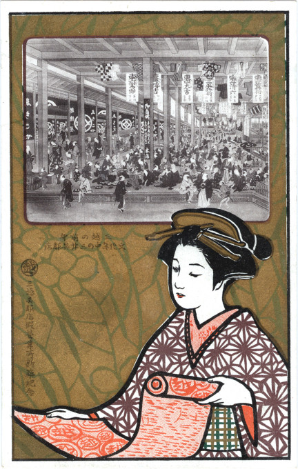Mitsukoshi department store advertising postcard, c. 1910, depicting the interior display of wares of Echigoya during the Edo era.
