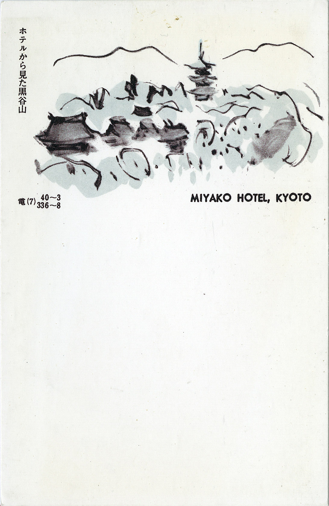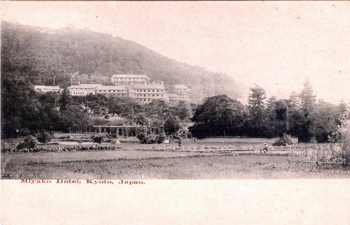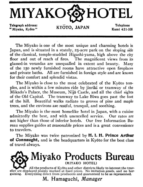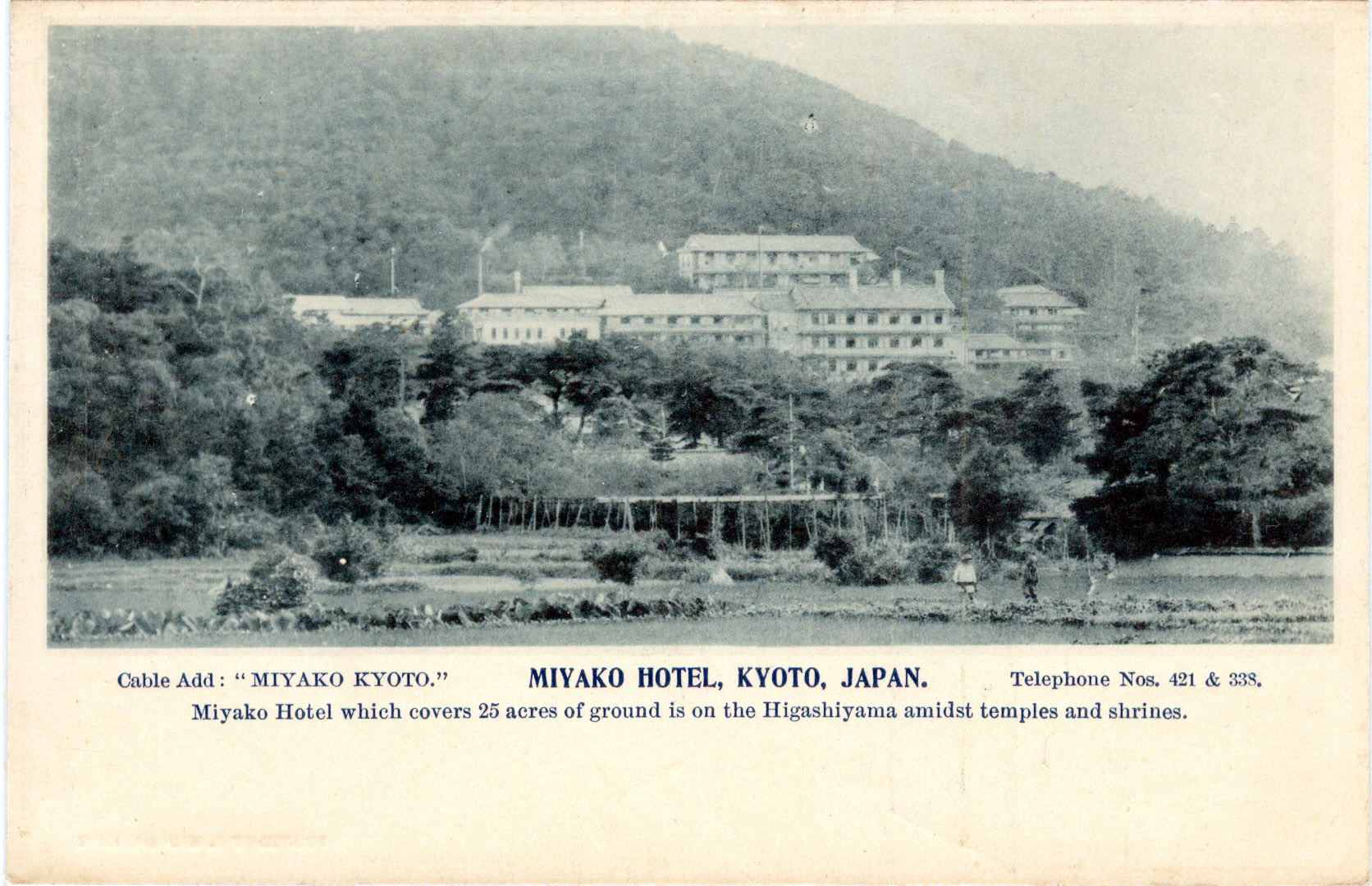“The Miyako Hotel is a celebrated and popular hostelry, in an attractive garden on the slope of Higashi-yama in the NE quarter of the city, high above the city and out of reach of the disastrous fires which sometimes sweep the business section.
