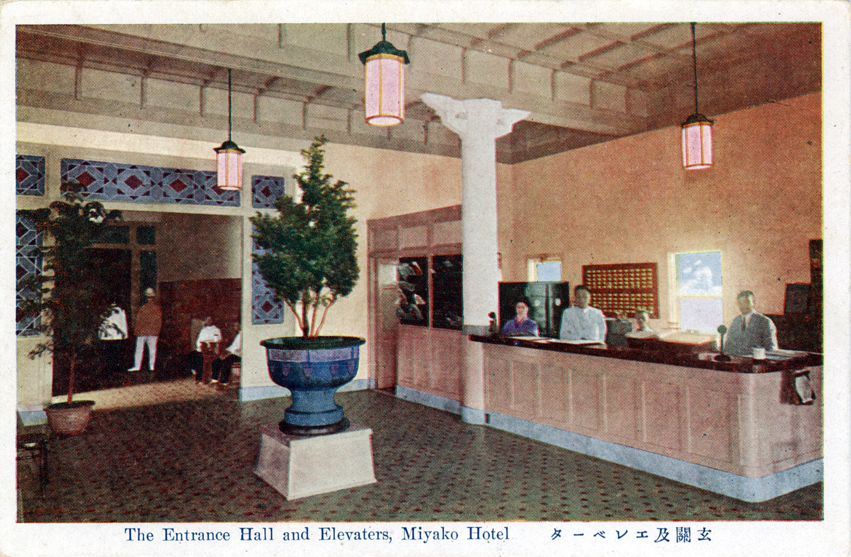 - Entrance hall and elevators, Miyako Hotel, c. 1920.