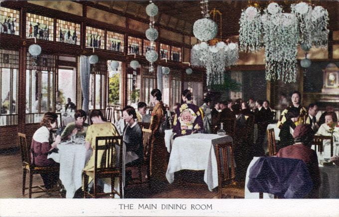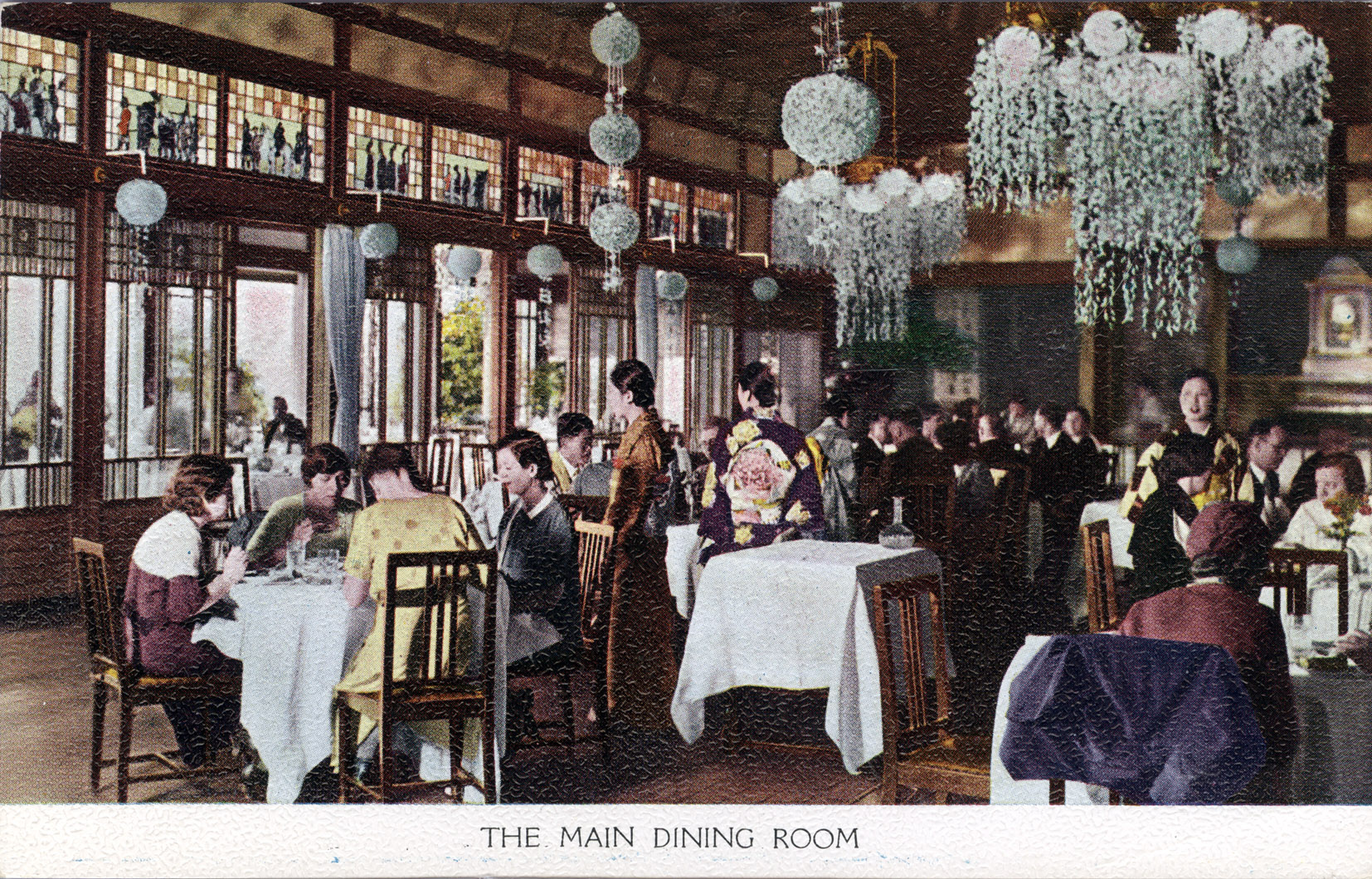 Dining room, Miyako Hotel, Kyoto, c. 1930. “The Miyako Hotel is favourably known to most distinguished travellers throughout the world. It is situated in the healthiest, prettiest, and most convenient part of Kyoto for sight-seeing and shopping.”