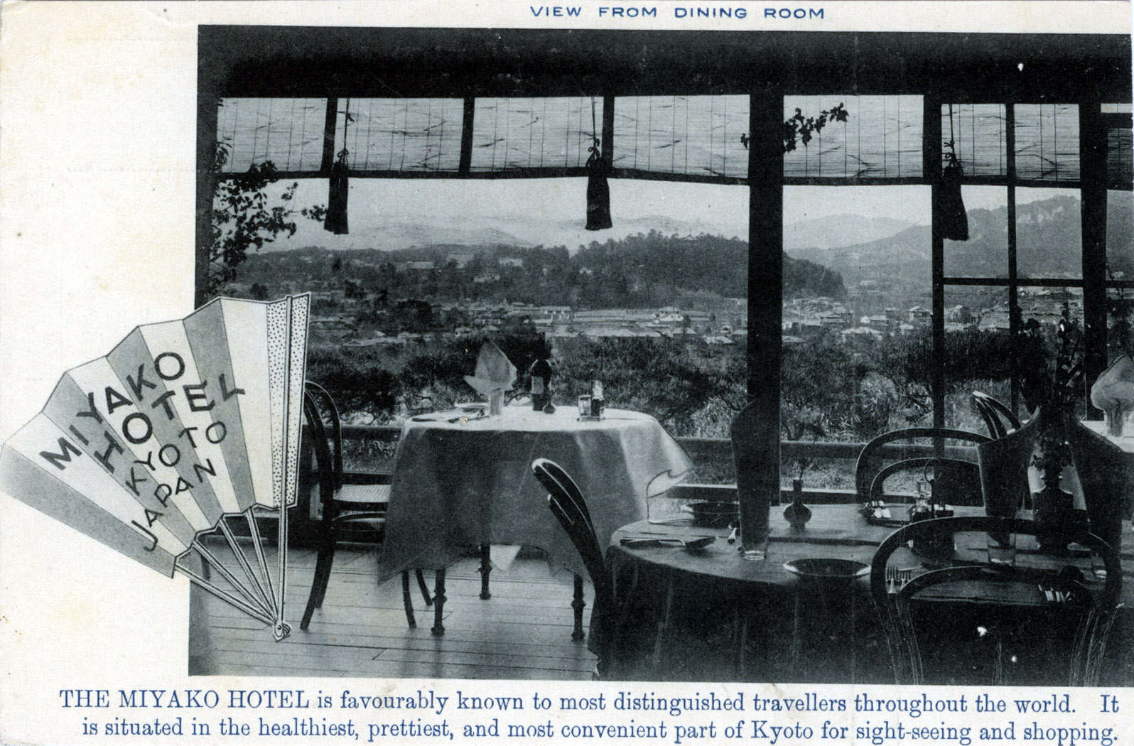“As one enters the long glassed-in [Miyako Hotel] dining room which overlooks the city of Kyoto, the artistic arrangement of the flowers – the fragrant iris, carnation, chrysanthemum, or other grouping of flowers such as is known only to the Japanese artist – catches the eye. The rolling of the napkins, standing upright in each glass upon the table, seems too to harmonize wonderfully with the art expressed in the arrangement of the flowers.