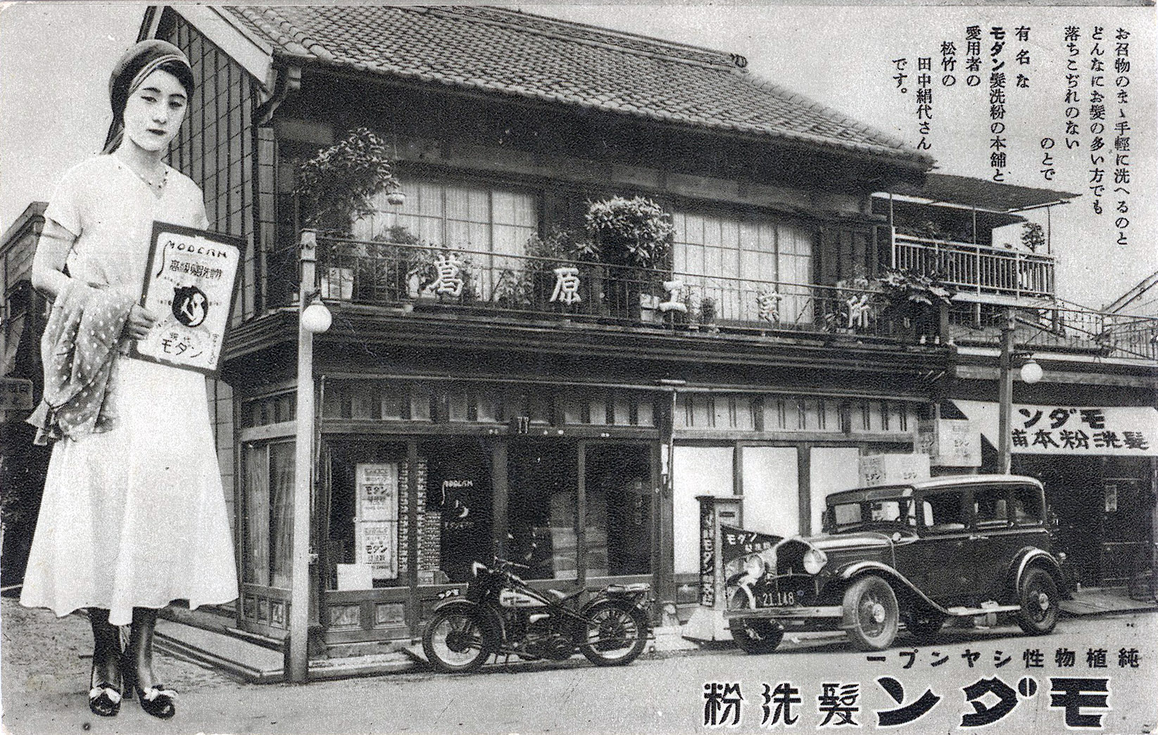 “Modern Shampoo” advertising postcard, c. 1935. “Wash your hair – and wash it with ease – no matter how much hair you have. [Endorsed by] the famous Tanaka Kinuyo of Shochiku [movie studio] and patron of Modern Hair Washing Cake Shop.” Also pictured in front of the “Modern Shampoo Bookstore”, located near present-day Shinagawa, Tokyo, are a 1930 Ford Model A 4-door sedan and an early-1930s Harley-Davidson motorcycle.