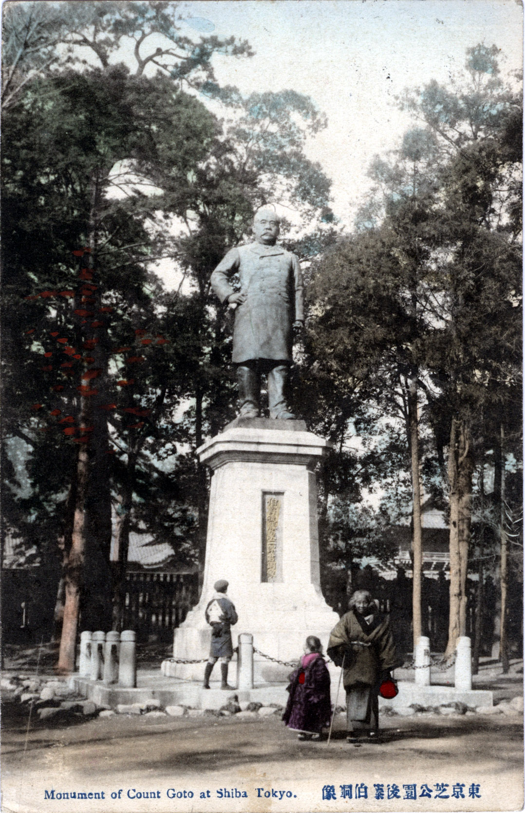 Mounment of Count Goto at Shiba Park, Tokyo, c. 1910. Goto was one of modern Japan’s early political figures. He became a very influential pro-Imperial proponent, exerting great influence on Tosa daimyō Yamauchi Toyoshige to call on shōgun Tokugawa Yoshinobu to return power peacefully to the Emperor. After the Meiji Restoration, Gotō was appointed to a number of posts, including that of Governor of Osaka. In 1874, he along with three others formed one of Japan’s first political parties (Aikoku Kōtō, ‘Public Party of Patriots’). In 1889, Goto served as Communications Minister; beginning in 1892, he served as the Minister of Agriculture and Commerce under Prime Minister Ito Hirobumi.