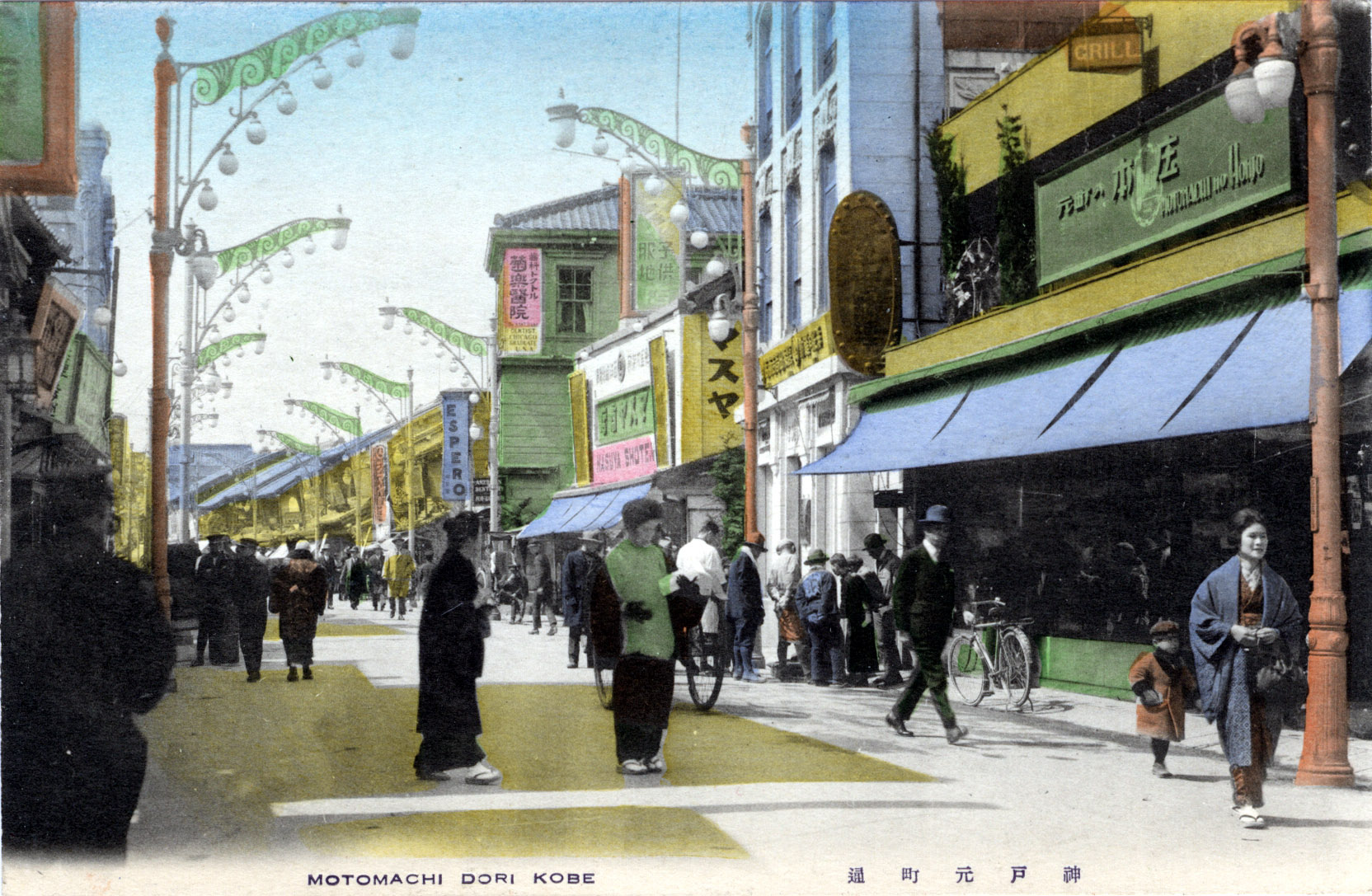 Motomachi-dori, Kobe, c. 1930. Motomachi is the central and historical shopping avenue of Kobe, located just north of the port docks and adjacent to both Nankinmachi (Kobe Chinatown) and Kyu-kyoryuchi (the Foreign Settlement of the 19th century). When the former Saigoku kaido*, connecting Kobe with the southern Honshu port of Shimonoseki, was formally renamed in 1874, one of its shopping traditions was the Seimon-barai, the annual street-long bargain sale first established in 1883. In the present-day, there are approximately 20 stores with long-established histories of 100 years or longer which still have a presence on Kobe’s Motomachi-dori. (*The route of the former Saigoku kaido became the “Main Street” and main market street of hundreds of cities and villages along its route, including Kobe and Hiroshima.)