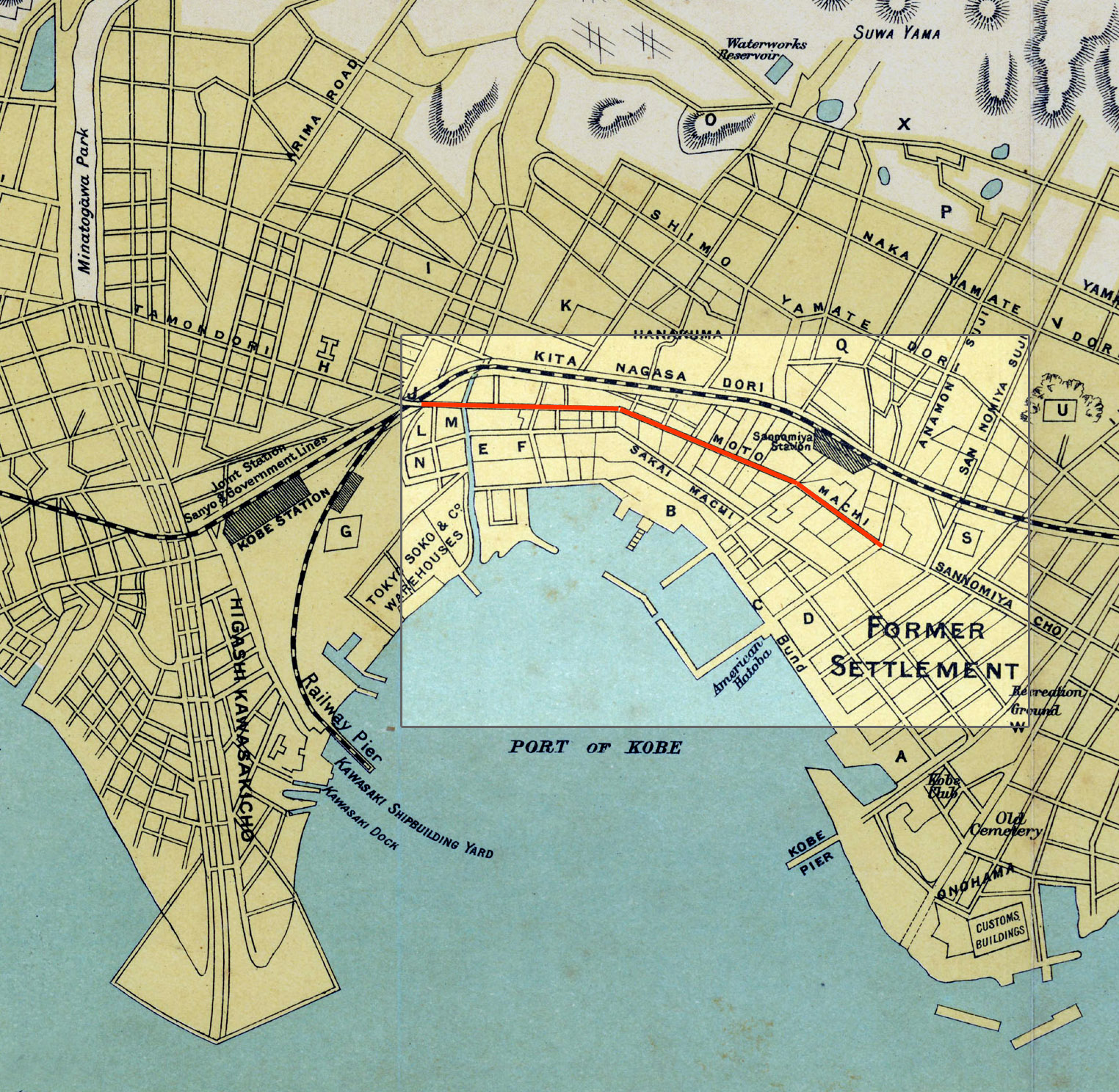 Map: The entire length of Motomachi-dori (in red), relative to the former Foreign Settlement and Kobe harbor, Kobe, 1908.