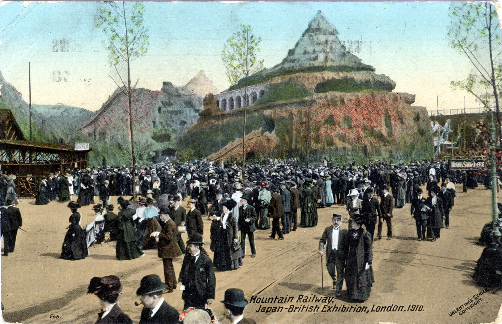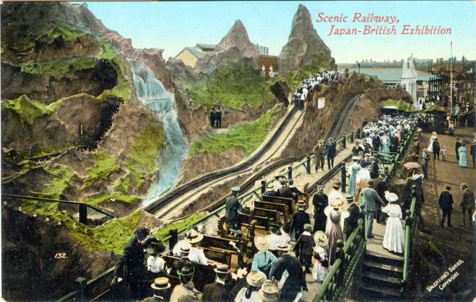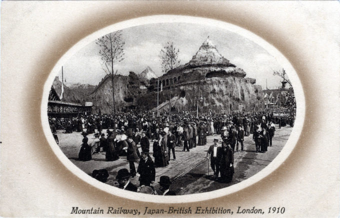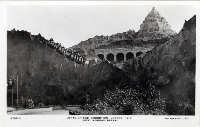“Scenic railways became a feature of exhibitions from 1908; they were usually encased in fake mountain-like scenery and were dubbed ‘mountain scenic railways’. One appeared in the Franco-British Exhibition at White City in 1908 … In the following year, John Iles built one for the Golden West Exhibition at Earls Court, and others appeared at the Japan-British Exhibition at White City in 1910 and the Festival of the Empire Exhibition at Crystal Palace in 1911.”