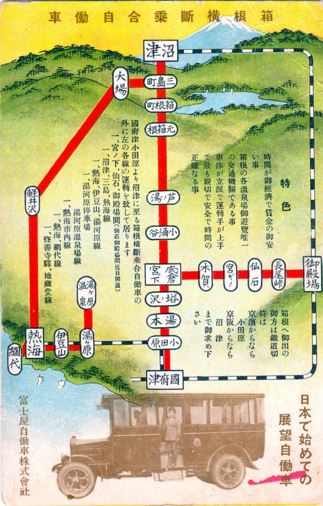 - Mt. Fuji and Lake Hakone railway access and bus routes, c. 1930. Inset image is of a Tozan Bus Co. bus (and conductor) that operated along the mountain roads.