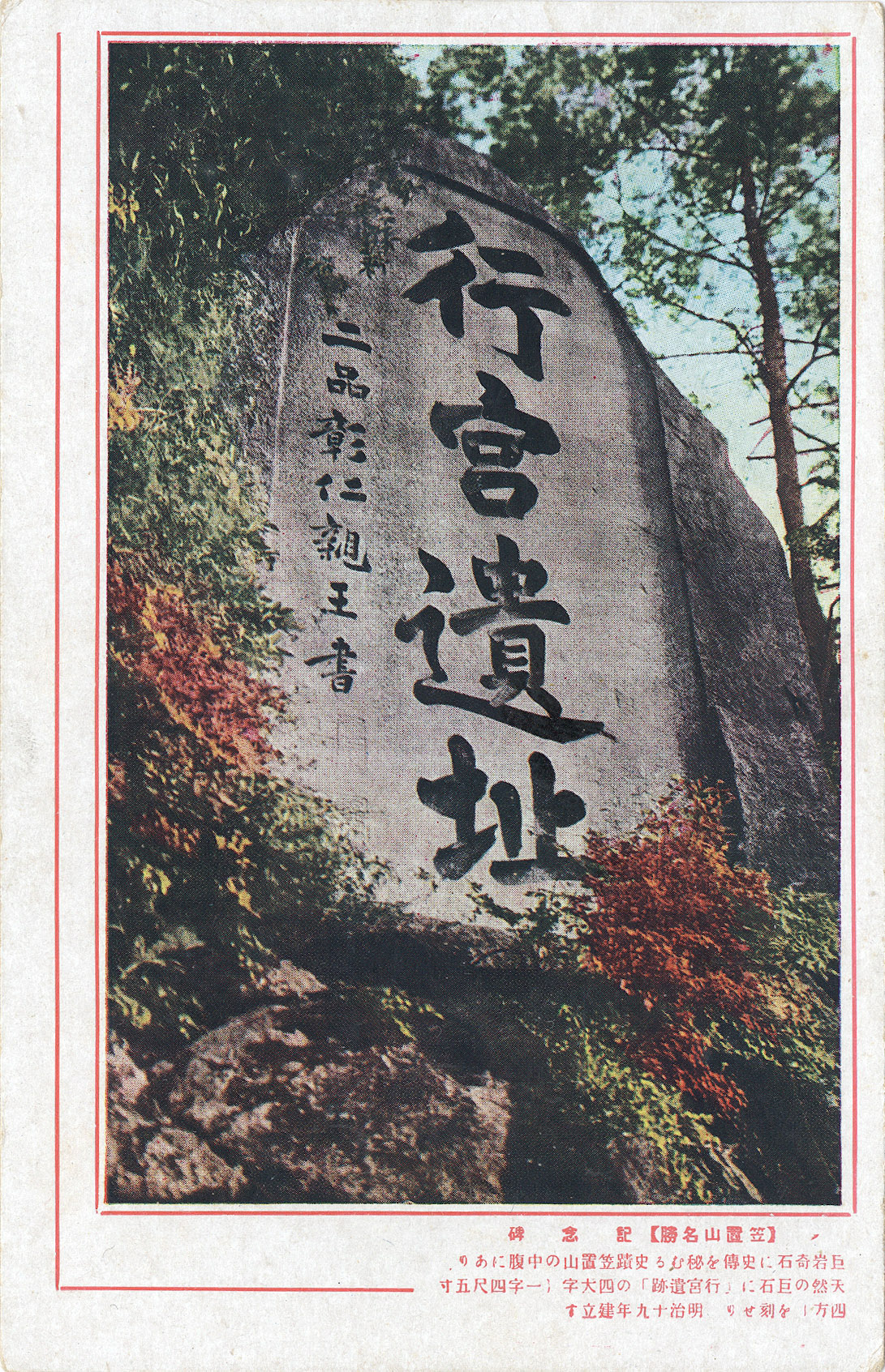 “Site ruins of the former imperial palace”, Mt. Kasagi, Kyoto, c. 1930. A story goes that the Emperor Temmu in the 7th century was once caught in a tremendous rain storm on this hill, when the Kokūzī–Bosatsu appeared and gave him shelter. The Emperor vowed to dedicate a temple to this deity as a thank–offering, and as a pledge he took off the hat he was wearing and laid it on a rock — hence the name of the rock and the hill. (‘Kasagi’ means “hat laying down”.)