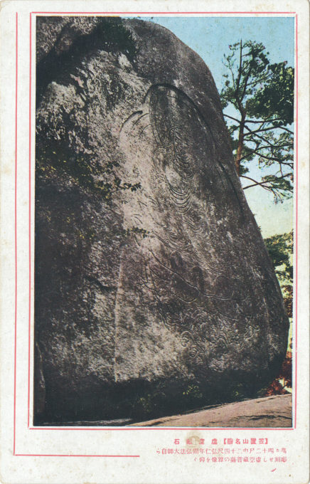 Mt. Kasagi, Kyoto, c. 1930. The image of the Kokuzo Bodhisattva carved into a large boulder by Kobo Daishi (it is said), the monk and poet who founded the esoteric Shingon school of Buddhism.