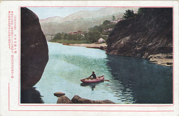 Kizu River, Mt. Kasagi, Shikagafuchi, Kyoto, c. 1930. The caption reads (in part): “The scenery is spectacular, the water is clear … and the boat ride is a perfect place to enjoy all four seasons.”