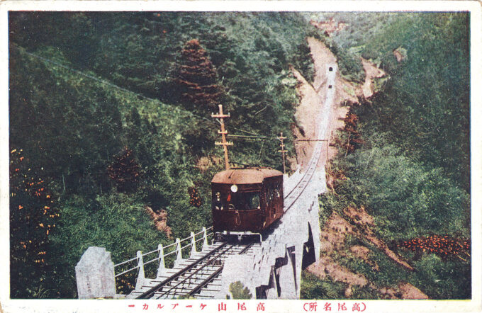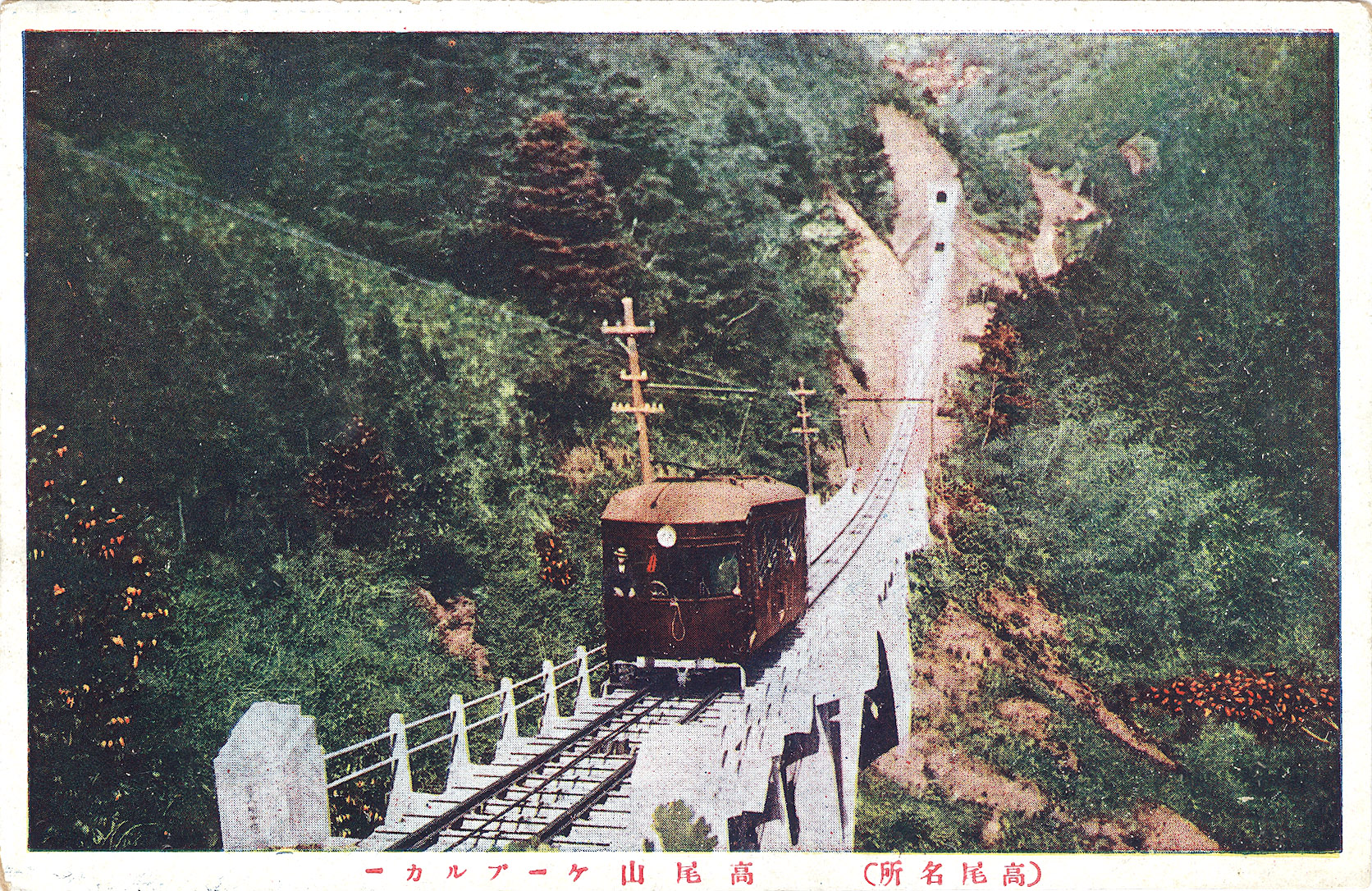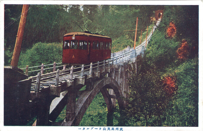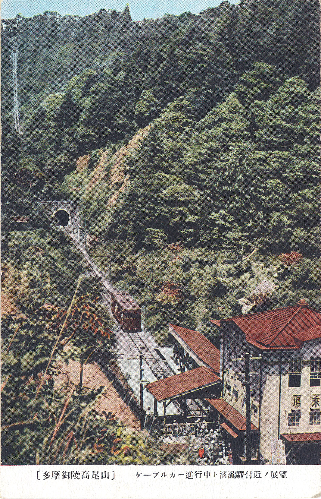 “Mt. Takao Cable Car near Kiyotaki Station”, Hachioji, c. 1930. The six-minute ascent from Kiyotaki Station to Takaosan Station has the steepest gradient of any funicular railway in Japan at ~31%.