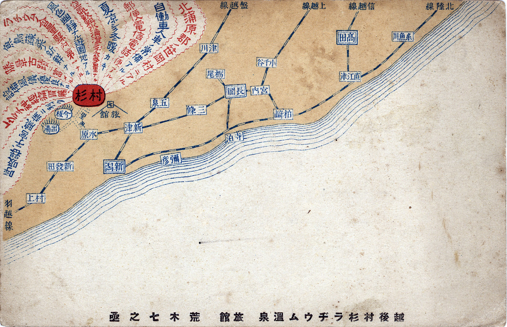 Murasugi Radium Hot Springs advertising postcard, Niigata, c. 1920, published by the Araki Shichinojo Inn, showing the nearest train stations (Niitsu and Mizuhara) and other means of area transportation including bus and automobile. (The first shared-ride car in Niigata Prefecture, a six-seat Ford Model T operated by inn owners, was operated on a regular basis between Mizuhara and Murasugi.) Tucked away in the rice fields and forested hills forming the Gozu (“Five Heads”) hot-spring area in Niigata Prefecture, the Murasugi radium hot springs are said to be over 700 years old, with legends date their discovery to the 14th century. The Araki family name is strongly associated with Murasugi — several local histories say many villagers used the Araki surname and that an Araki ancestor is traditionally credited with discovering the spring centuries earlier.