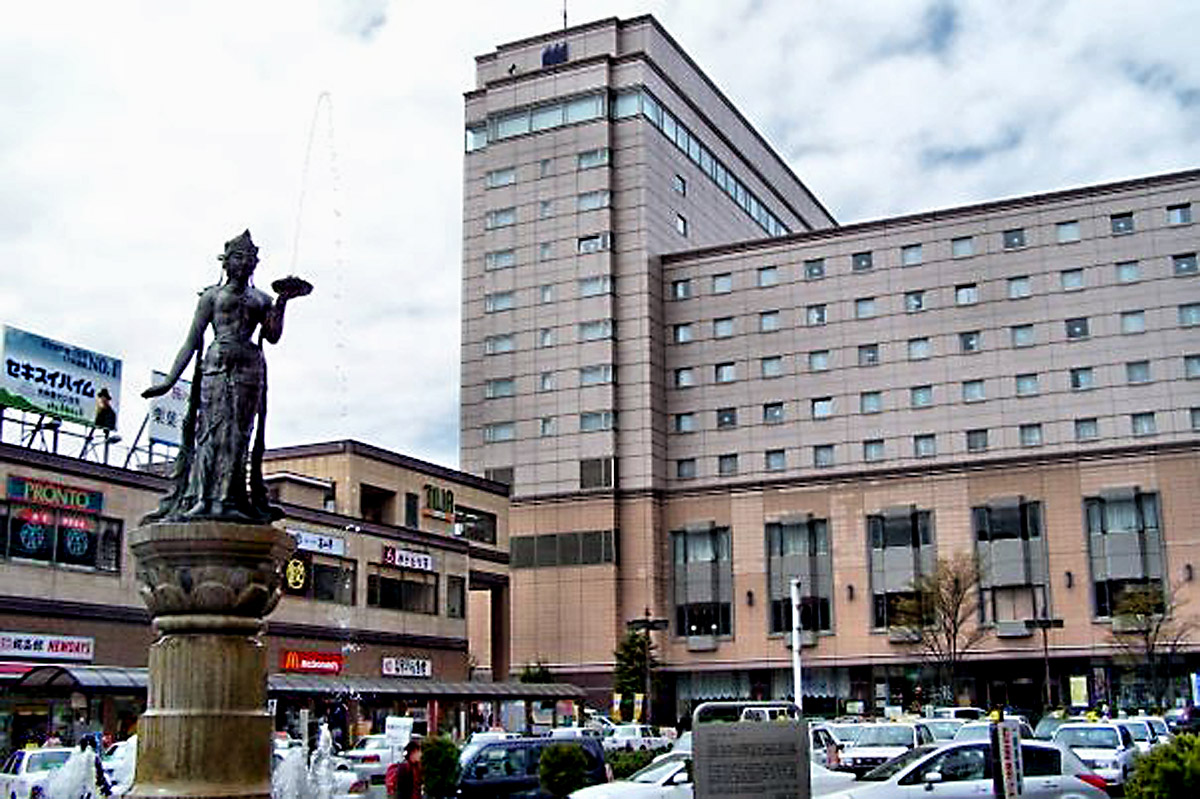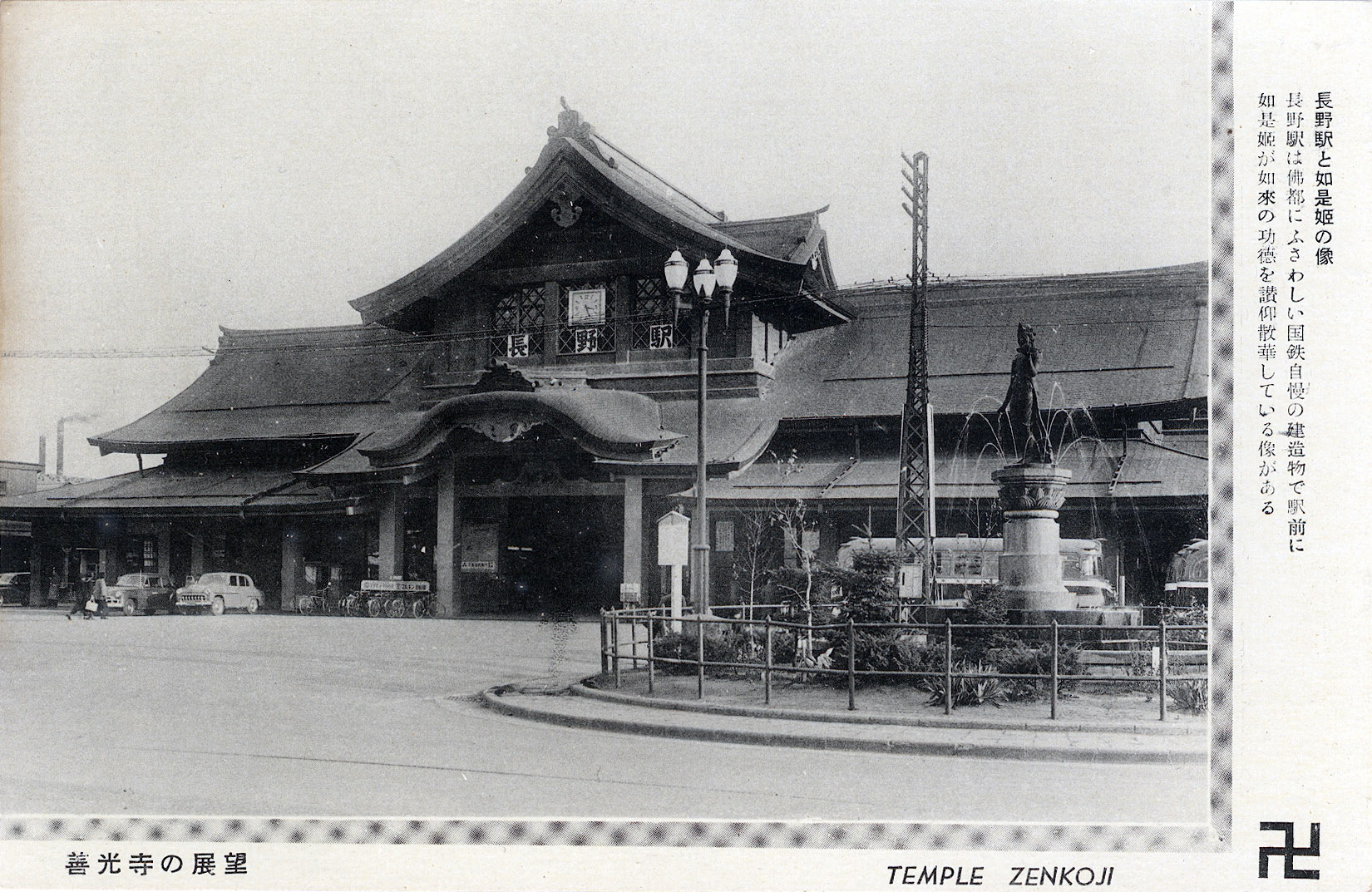 Nagano Station and Princess Nyozehime statue, c. 1960. Nagano Station opened in 1888 on the Shin’etsu Line (née Naoetsu Line). Princess Nyozehime is affiliated with the origin of nearby Zenkoji Temple, and the station’s location facing the temple, 18 cho (about 2 km) distant, was dictated by the 18 vows of Amitabha, the celestial Buddha, enshrined in the nearby temple.
