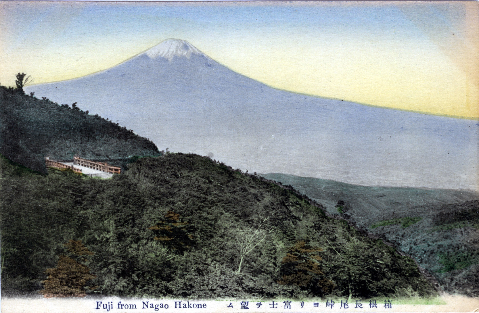“You climb to the top of Nagao Pass by a very narrow winding road which is quite good but necessitates cautious and sensible driving. This Pass is also known as Long Tail Pass [na-ga-o], and at its summit you are at a height of 2,962 feet. An exceptional view of Mount Fuji, from base to summit, can be seen on a clear day, as well as sparkling Lake Hakone off to your left in the distance.