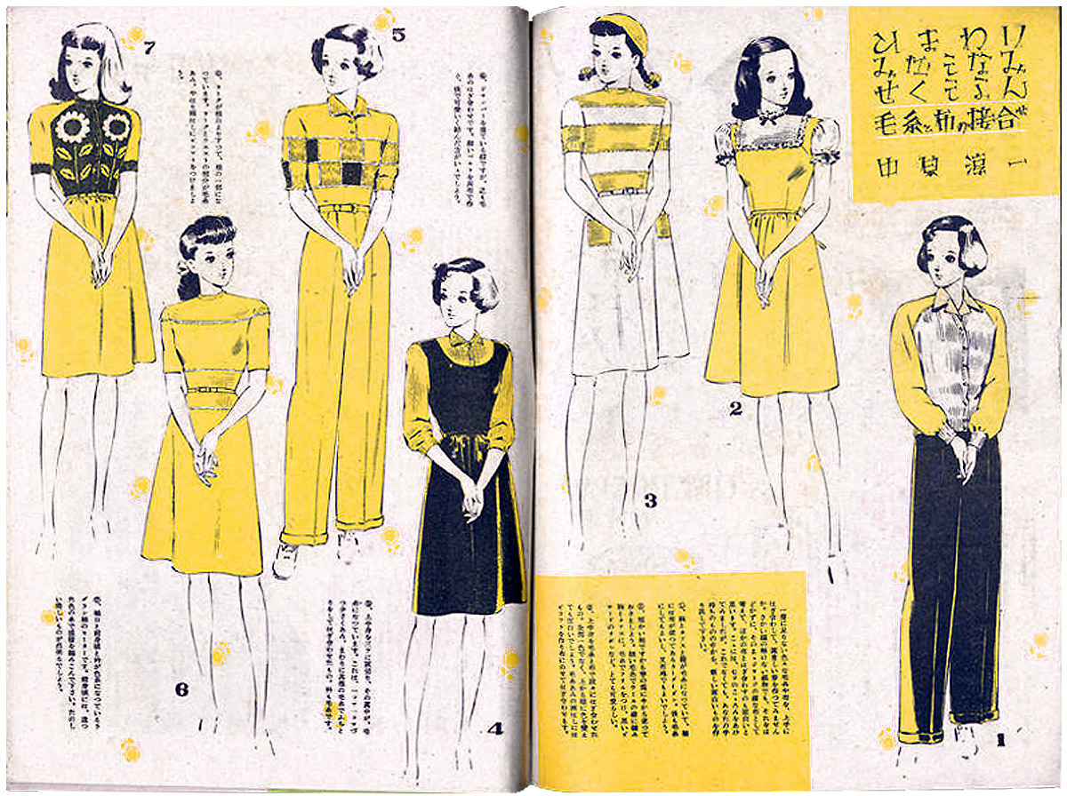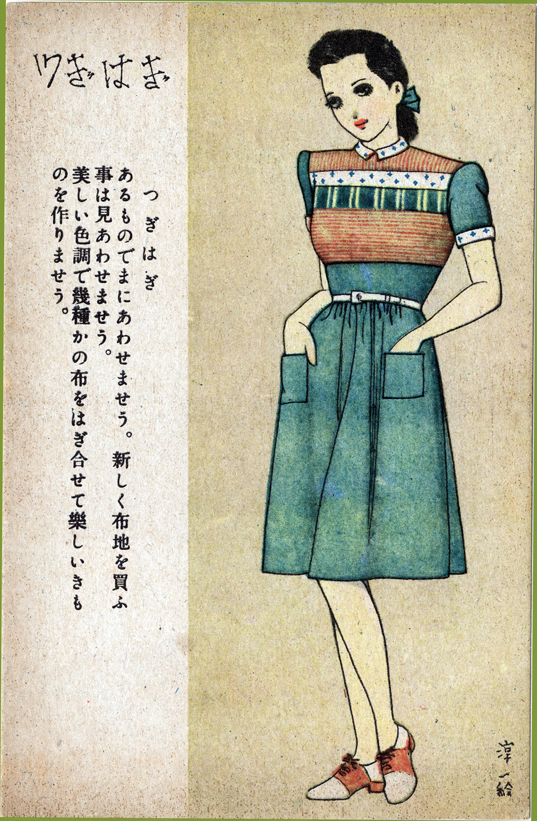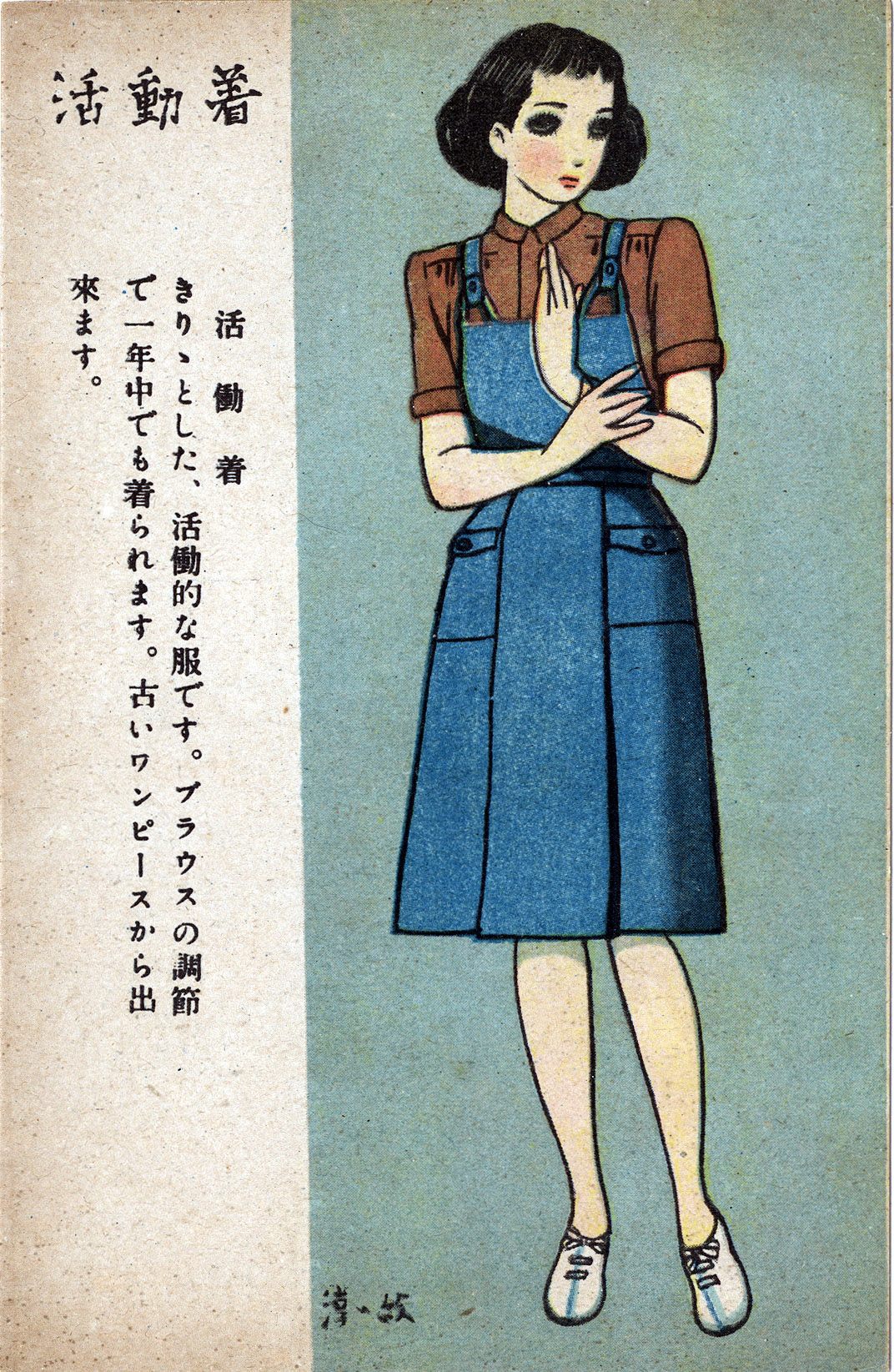 - “Active clothing”, Nakahara Jun’ichi illustration postcard, c. 1945. The caption reads “This [style] is a crisp, active garment. It can be worn all year round by adjusting the blouse. It can be made from an old dress.”