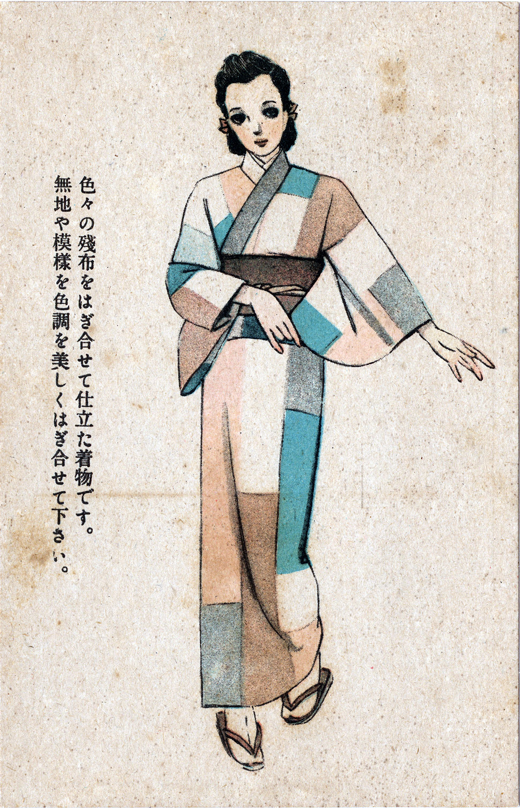 - Nakahara Jun’ichi fashion illustration postcard, c. 1945. The caption reads: “It is a kimono made of various homemade fabrics. Please mix and match plain and patterned fabrics with beautiful colors.”