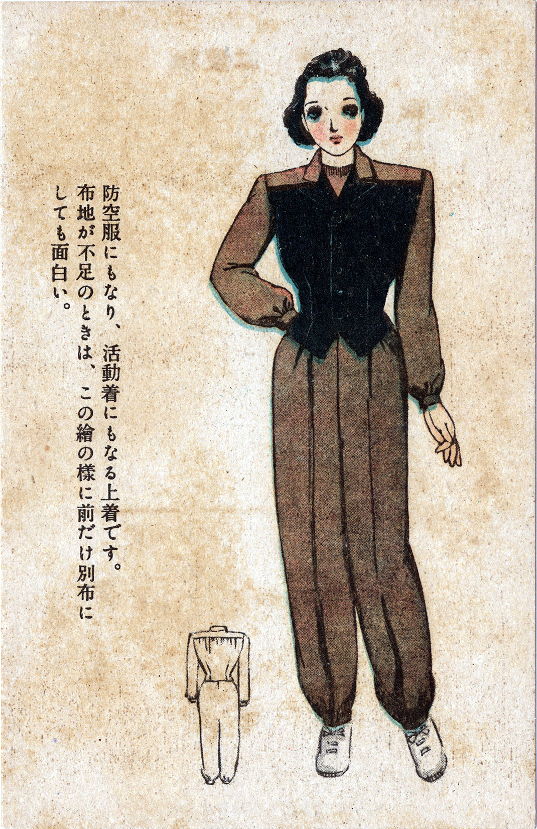- Nakahara Jun’ichi fashion illustration postcard, c. 1945. The caption reads: “This jacket can be used as both an air defense suit and an activity suit. When one fabric is in short supply, it is interesting to use a different fabric for the front only, as shown here.”