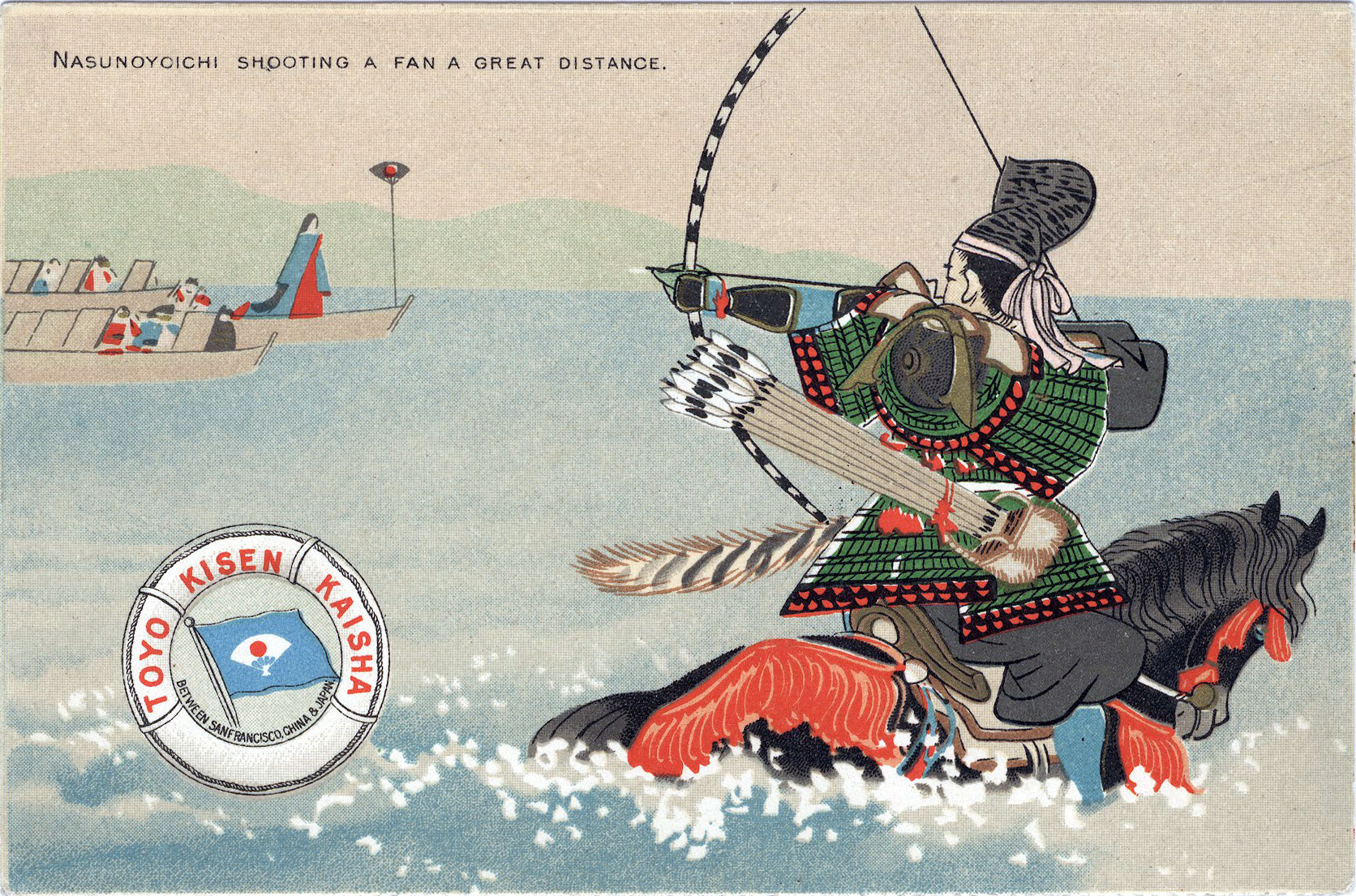 “Nasunoyoichi shooting a fan [at] a great distance”, c. 1920. Japanese folklore advertising postcard published by the Toyo Kisen Kaisha (T.K.K.) passenger shipping line.