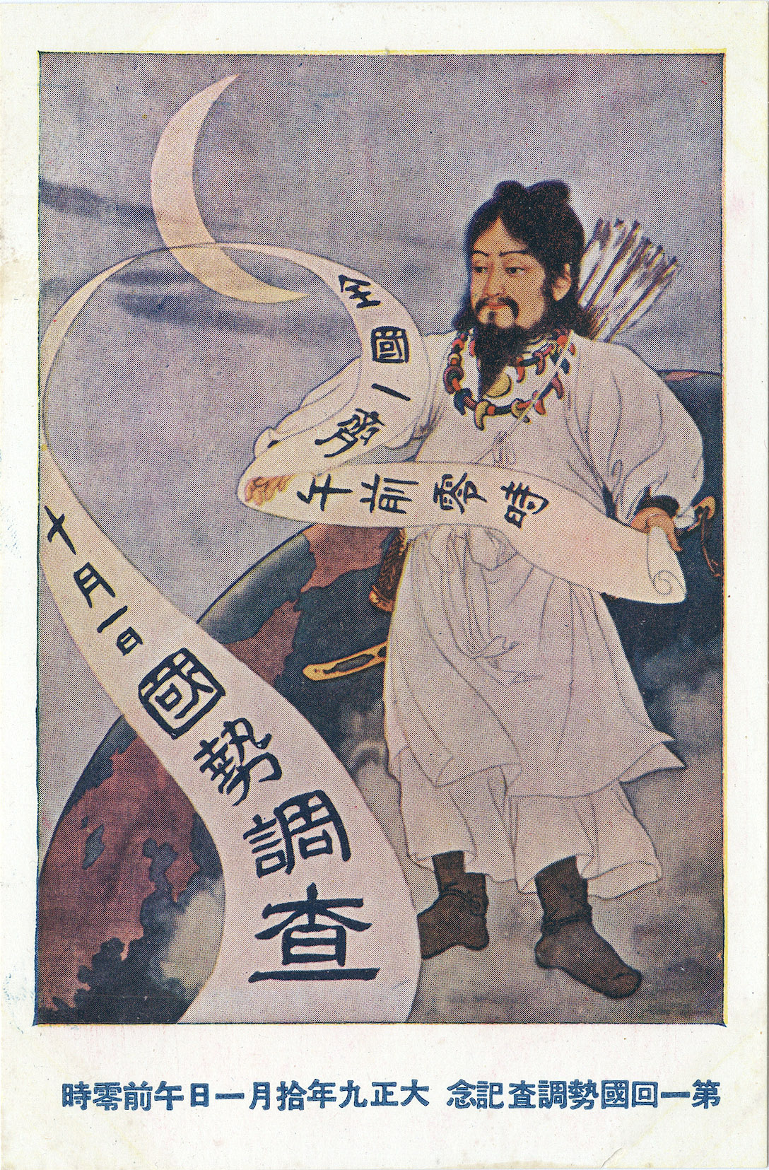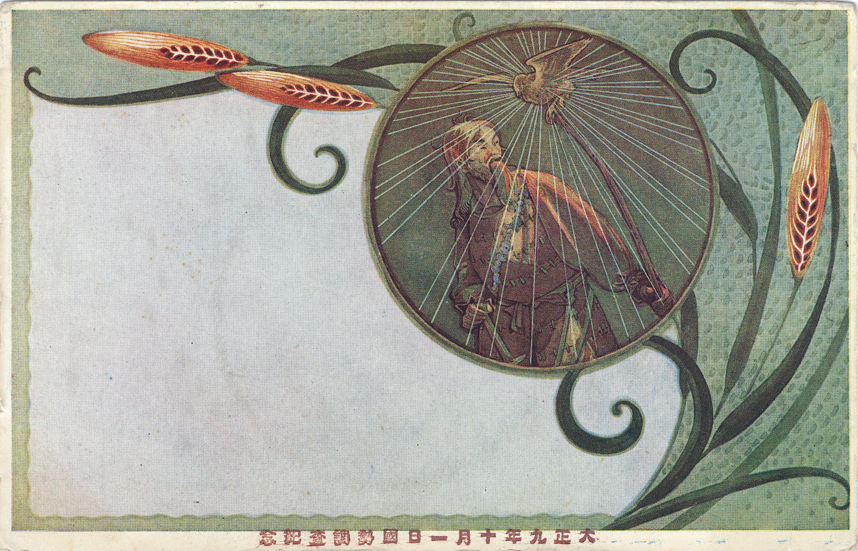 First national census commemorative postcard, 1920. The postcard is captioned with the date of the first census: Taisho 9.10.1 (Oct. 1, 1920).