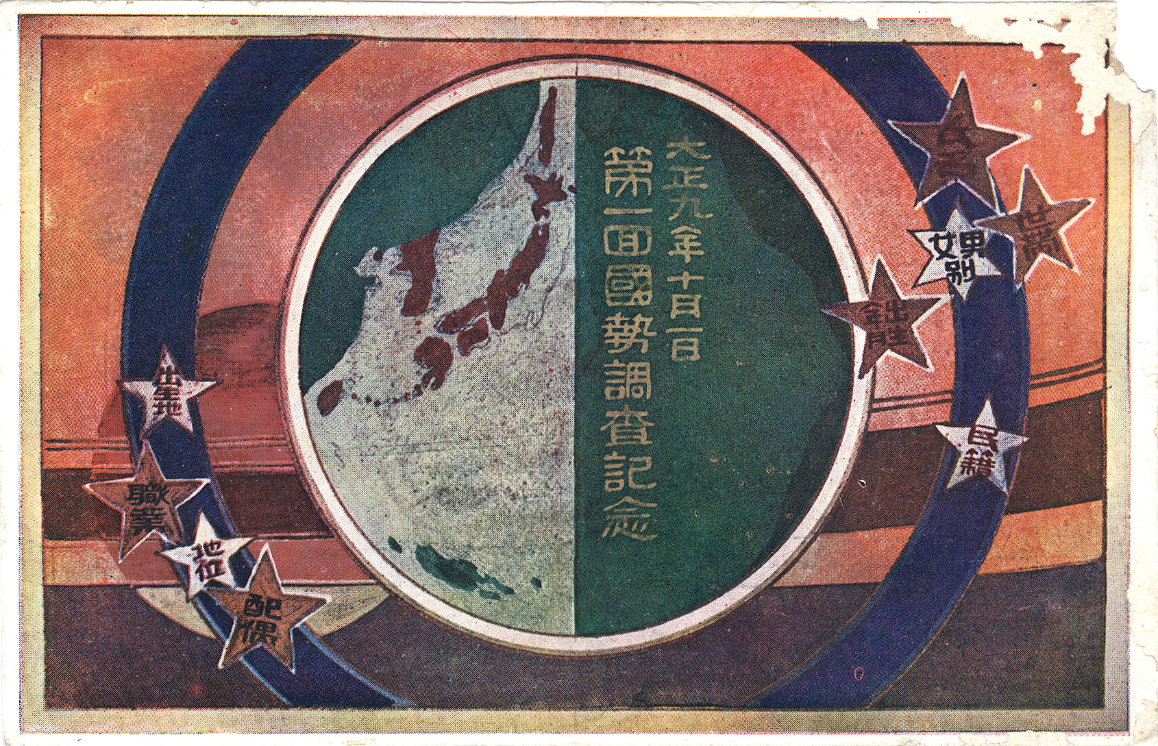 First Population Census commemorative postcard, 1920. The populations of the Home Islands (Hokkaido, Honshu, Shikoku, Kyushu) were counted along with Imperial Japan’s colonies and possessions: Chosen (Korea), Formosa (Taiwan), Nansei-shoto (Ryukyu Islands), and Karafuto (Sakhalin Island).