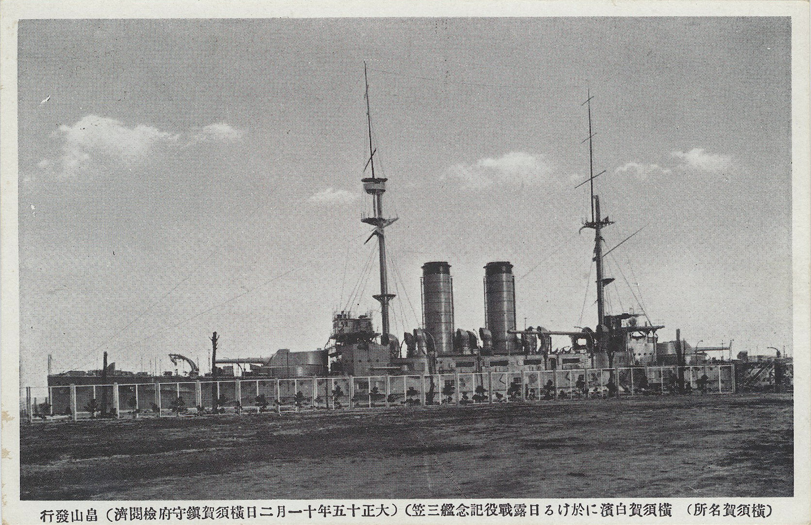 Battleship Mikasa, Yokosuka, c. 1930, an example of a “museum ship”, on display at Yokosuka Naval Yard. The only surviving pre-dreadnaught battleship in the world, Mikasa was decommissioned following the Washington Naval Treaty of 1922 and scheduled for destruction. However, at the request of the Japanese government, each of the signatory countries to the treaty agreed that Mikasa could be preserved as a memorial ship with her hull encased in concrete.