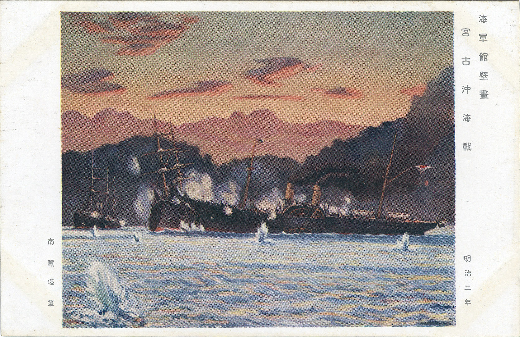 Naval Battle of Hakodate (May 1869), Boshin War commemorative postcard, c. 1930. Foreground: Kosetsu, a modern steam-powered ironclad ram with mounted gunnery, served as the Imperial Japanese Navy’s flagship of a small ad hoc fleet assembled for the operation to land troops at Washinoki Bay north of the rebel capital at Hakodate on peninsular Hokkaido. Although considered technically superior, the Tokugawa navy was routed by the Imperial fleet.