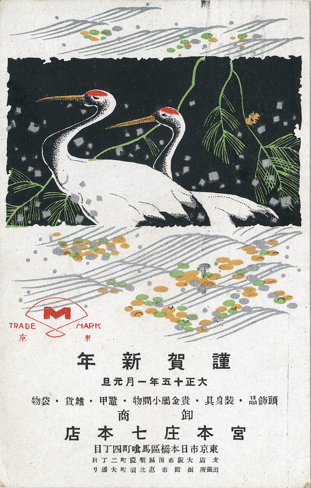 New Year’s advertising postcard, Kanbonjo Wholesale Co. (7th Branch), Nihonbashi, Tokyo, 1926, with branches in Osaka and Hakodate. The Japanese regard the tsuru (crane) as auspicious, mystical creatures often referred to as “birds of happiness” or “birds of peace” and a powerful symbol of longevity, good fortune, and happiness. This intrepid wholesaler dealt in head wear, shoulder wear, precious metal items, tortoiseshell work, and sundries from a warehouse located in what was until the 1923 earthquake, Tokyo’s primary wholesale and warehouse district, and the city’s fish market.