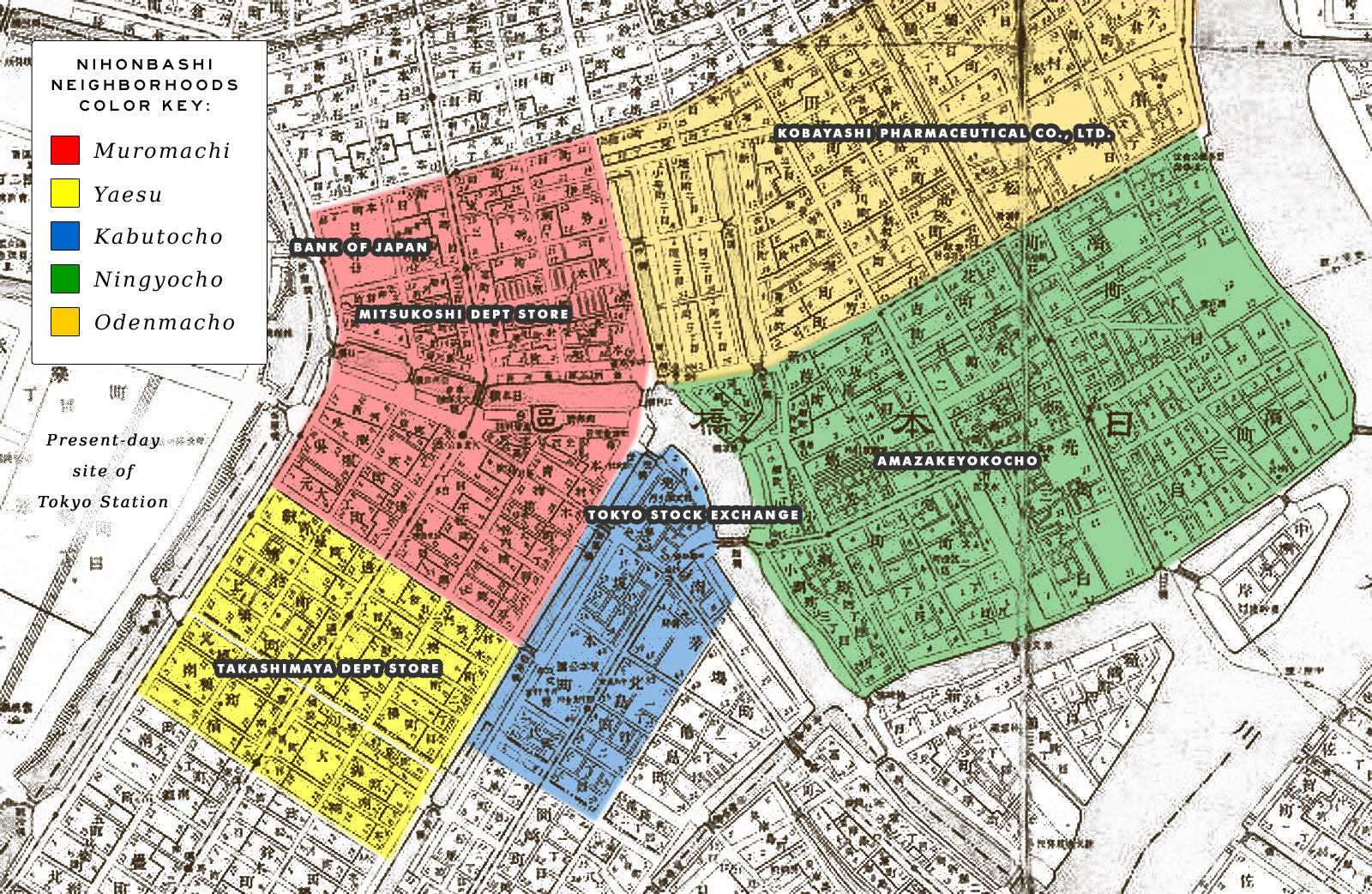 Map: The five main neigborhoods of Nihonbashi, Tokyo, c. 1910, with each represented by a major financial institution or major retail business. The western half of the district was and is primarily populated with financial and high-end retail establishments. The eastern half has historically been more populated with smaller merchants and artisans. Japan’s oldest toothpick shop, Nihonbashi Saruya, founded in 1704, is still located in Odenmacho, Edo’s former commercial center. Its neighbor to the south, Ningyocho, also known as “Doll Town” for its ningyo joruri (puppet theater) history, is still home to Tamahide, the legendary restaurant credited with inventing oyako donburi (chicken-egg rice bowl) in the mid-17th century.