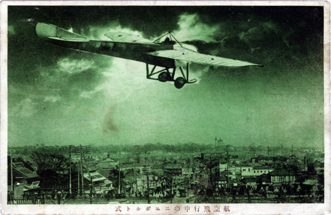 A Nieuport IV winging over Tokyo, c. 1914, with the dome and tower of the Nikolai Cathedral at Ochanomizu in the distance.