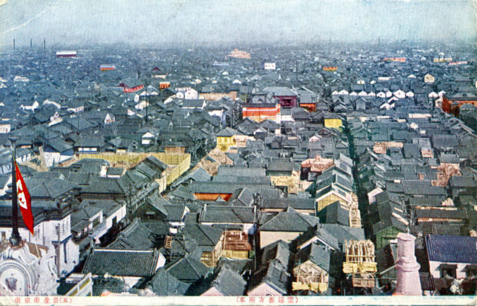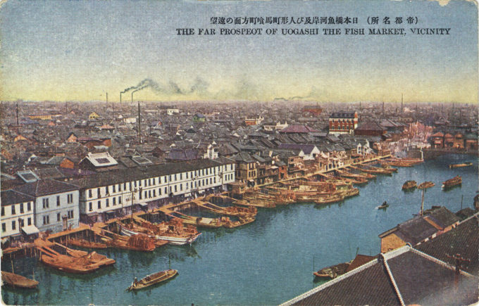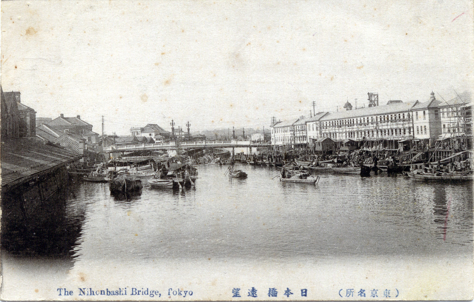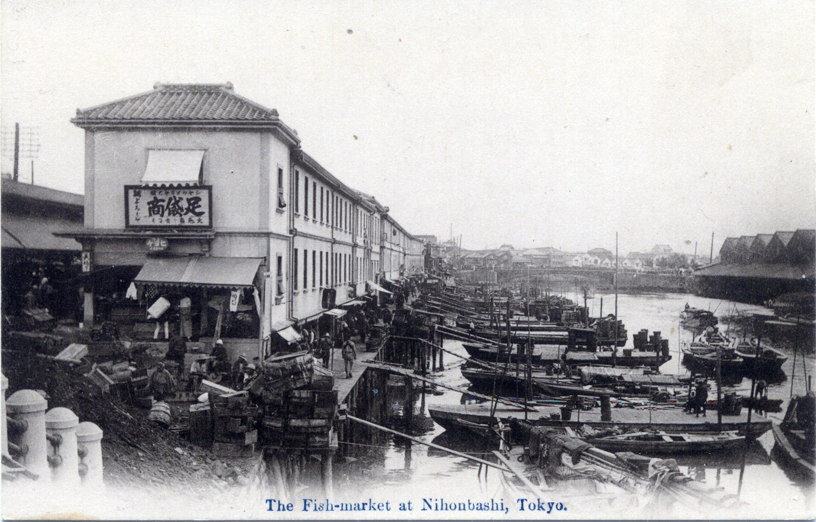 At the dawn of the 20th century, the Nihonbashi [Japan bridge] district (named for Japan’s most prominent bridge from which all distances in the country were measured) still had a marketplace atmosphere about it. The presence of canal-side warehouses, shophouses, and fish markets, important purveyors of goods and services during the Tokugawa era, would remain until the last of the fishmongers were relocated to Tsukiji following the 1923 Great Kanto earthquake.