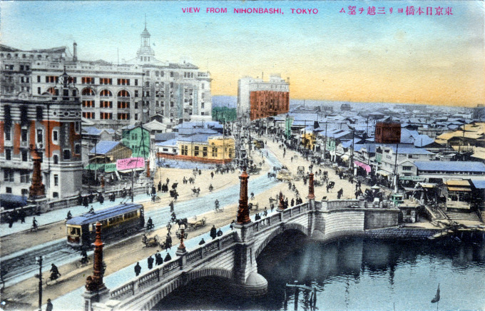 - Nihonbashi Bridge, elevated tinted view north toward Mitsukoshi department store, c. 1920.
