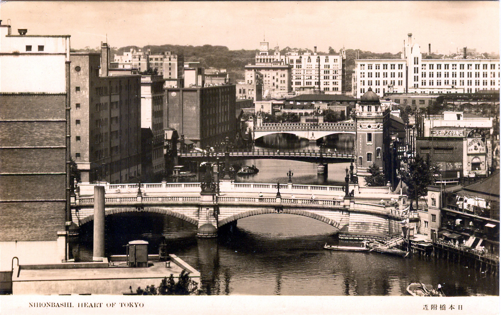 (Foreground-to-back) The Nihonbashi, Nishikashibashi and Ichikokubashi bridges, c. 1920, looking west along the Nihonbashi canal toward Otemachi and the Imperial Palace grounds, before the relocation of the fish markets to Tsukiji following the 1923 Great Kanto Earthquake. To the right of Nihonbashi is the Imperial Hemp Building, designed by Kingo Tatsuno and completed in 1911.